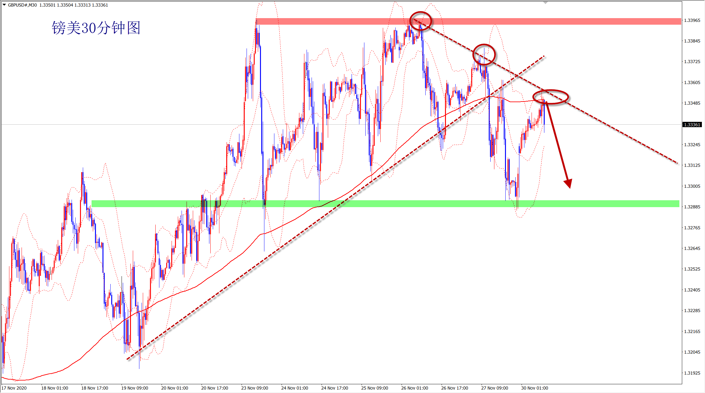 从30分钟走势图上,可以看出镑美当前维持1.328-1.340区域内震荡,现在行情走下跌回调段,并且受到趋势线的压制,短线还将继续回调,今日反弹至趋势线阻力位置后将继续下行!空,欧盘1.335位置进场空,下方跌至1.328区域后再反手多!