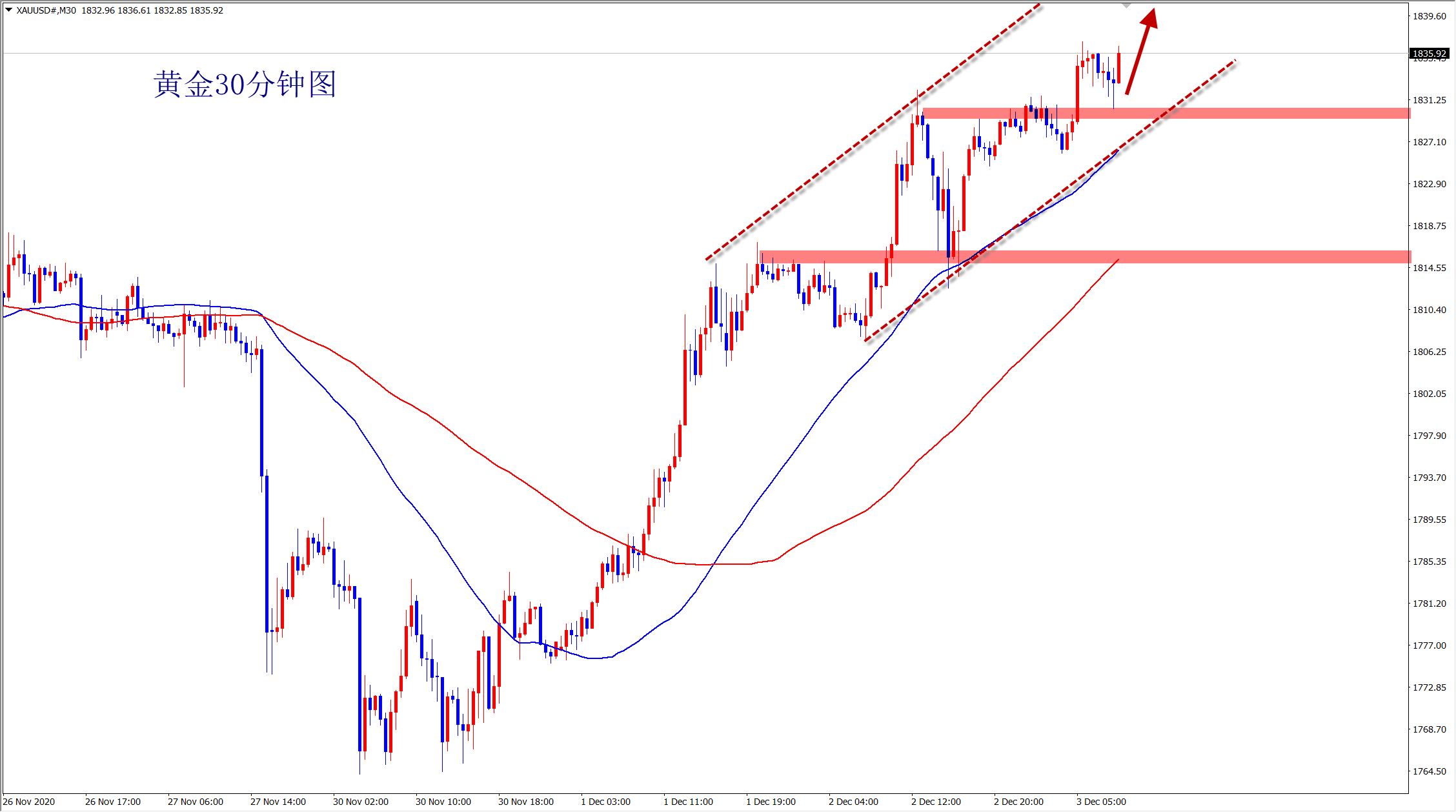 黄金1830上多,保护1825,目标1848;