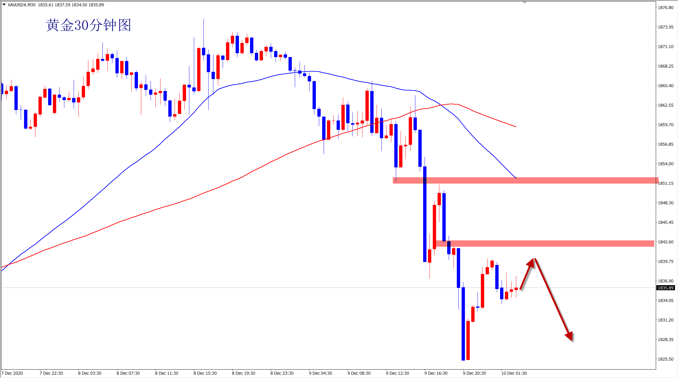 黄金当前转为跌势,我们的策略也很简单,反弹就是空,美盘依托1845的压力继续空即可!下看1825甚至1815位置!