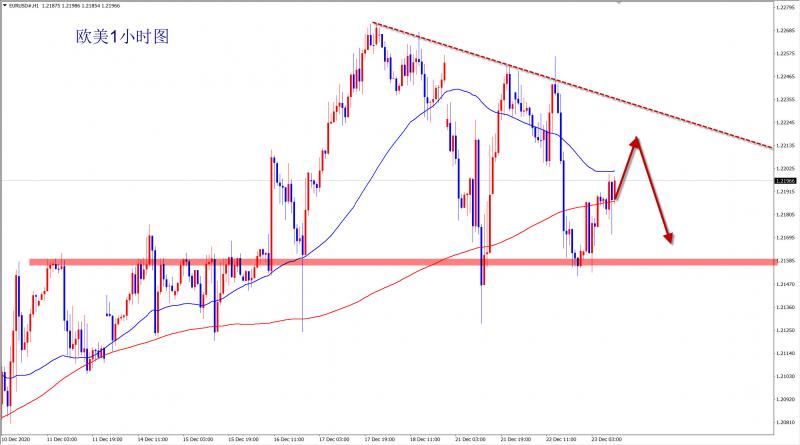 欧美此前一直维持多头上涨走势,但没有只涨不跌的行情,没有回撤蓄力就没有再次发力新高!而当前的欧美就是再次回踩蓄势的过程,而且从1小时走势上看,当前的震荡区间维持在1.210-1.225区域内运行,现在反弹遇阻的情况下,欧美很可能会再次回落下方1.210附近的支撑!