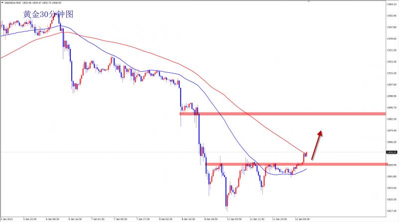 黄金1855多,止损1850,目标1865-1880;