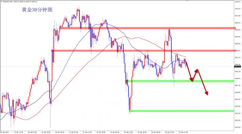 黄金早盘已经提示1860附近空,空单已经进场,行情整体波动不大的情况下,欧盘我们继续持空看跌!下方还是关注昨日回踩1847-50区域的支撑,破位后将会下探周五1837一线,甚至破位下行!