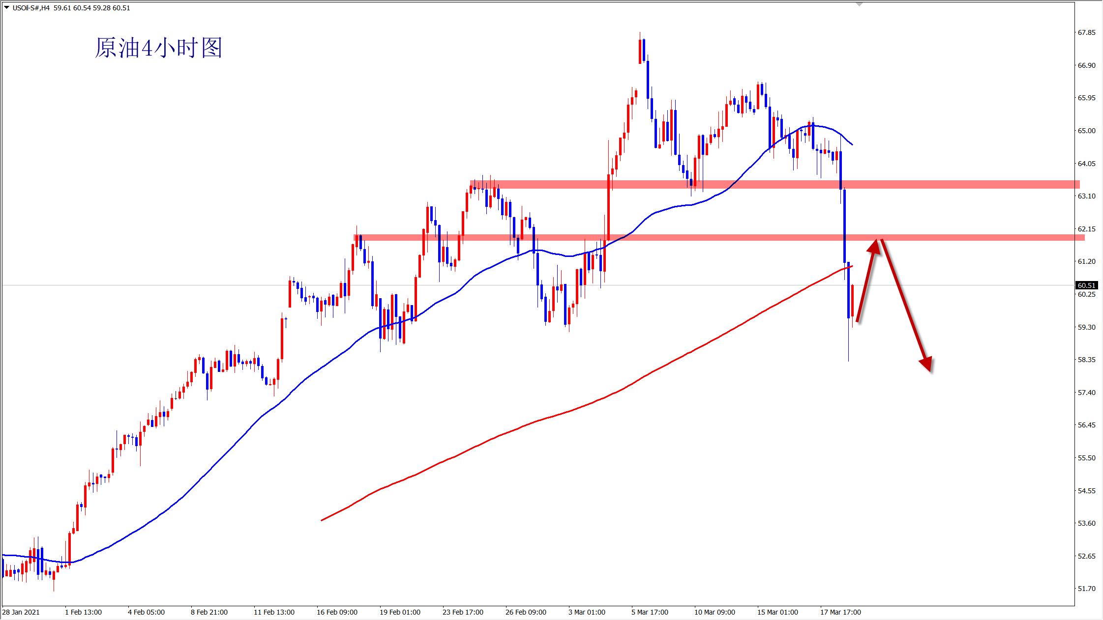 正如此前一路跌至负数,然后自去年4月份后再一路涨至68一线,中间虽然有盘整有震荡,但是趋势势不可挡!而当前原油开启跌势,那么操作上自然以主空为主!今日依托58支撑做多,仅仅是超跌后搏反弹!但跌势不变!