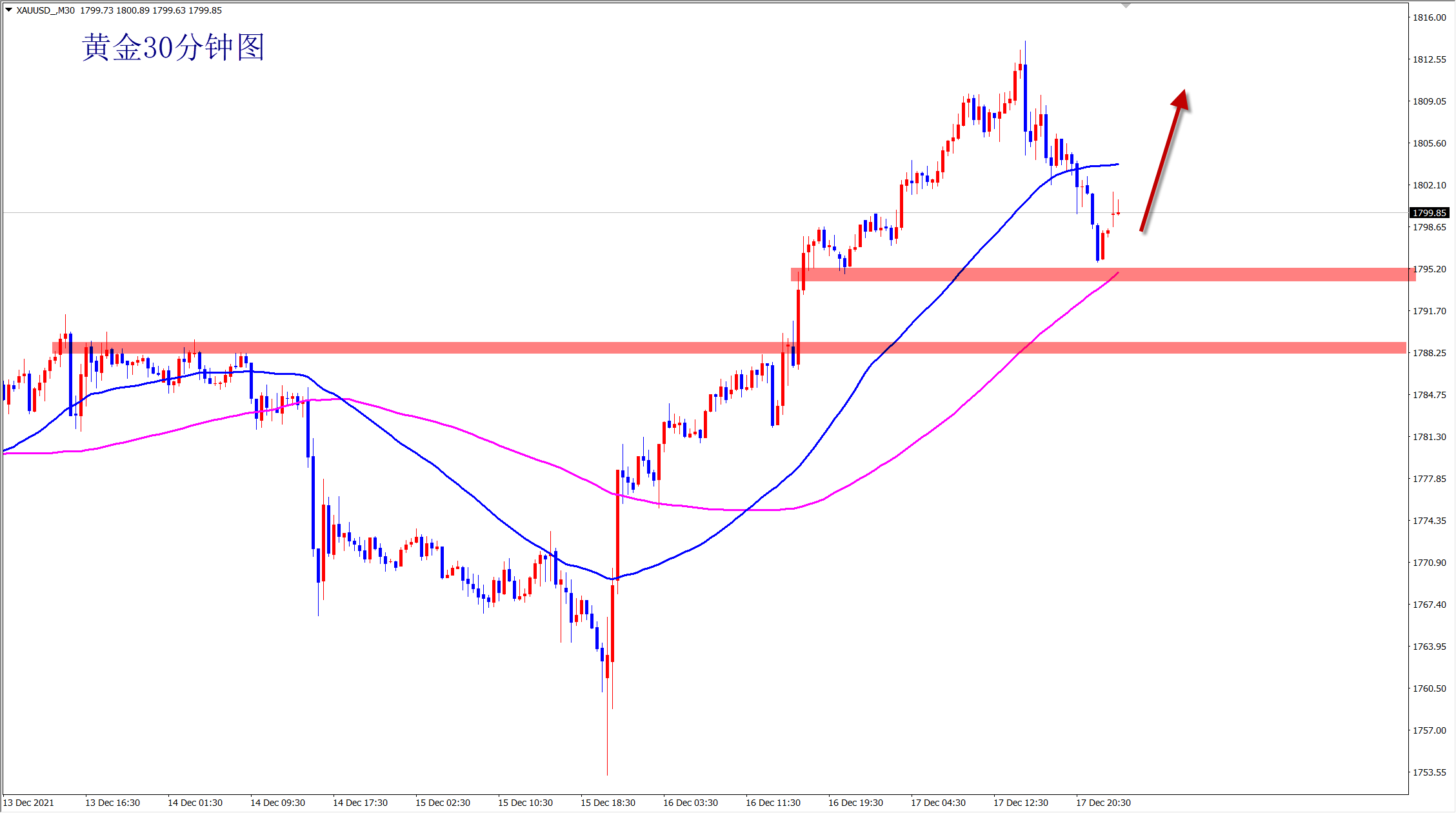 黄金上涨走势不变,周五的回调属于大涨过程中的正常调整,也是对此前突破后的回踩确认!站稳此前盘整1788支撑上方,黄金就是多头上涨趋势,我们的思路只有一个干多!