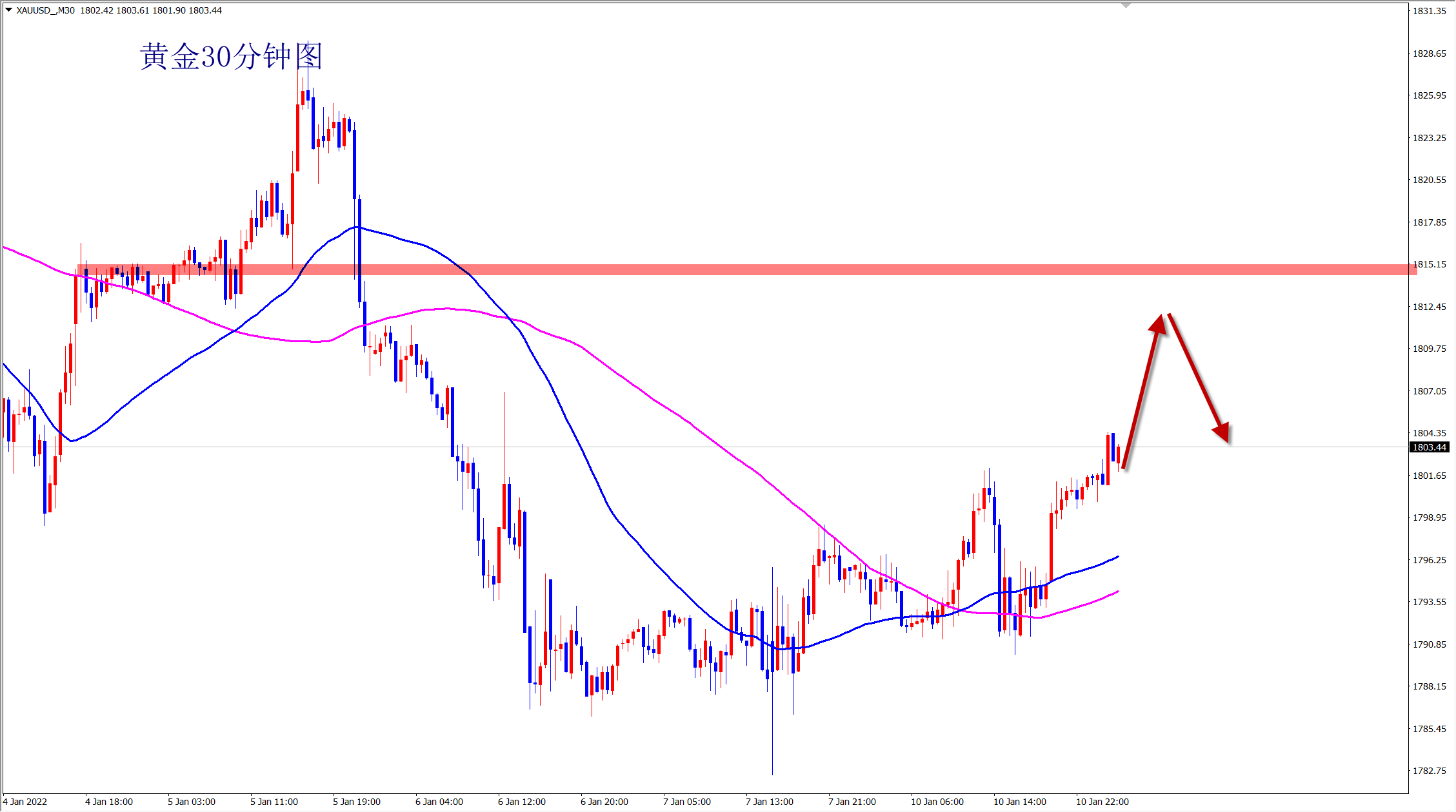 周末策略中已经提示,黄金前半周会以震荡或者反弹为主,是对此前大跌后的震荡修正,操作上以高空为主,低多为辅!当前行情反弹突破1800压力,那么接下来就要上行测试1810甚至1815位置!下方1790位置昨日多次回踩不破,支撑明显!