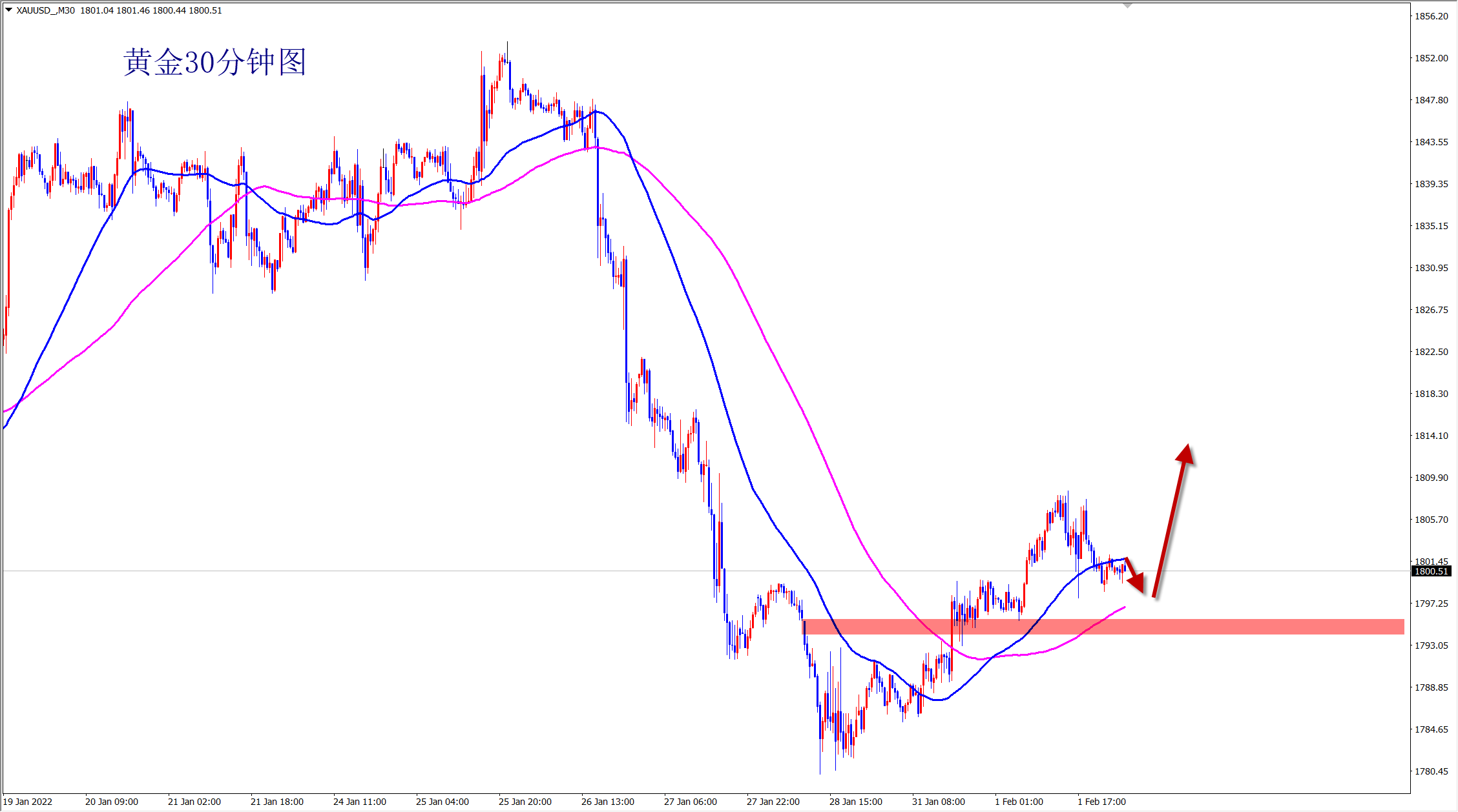黄金当前处于反弹走势,而且非常强势,遇阻后回落的幅度有限,反弹继续!当前在1797位置获得支撑,昨日的回踩也没有破位,我们继续依托30分钟的均线支撑干多看涨,上方的压力还是关注1815位置!