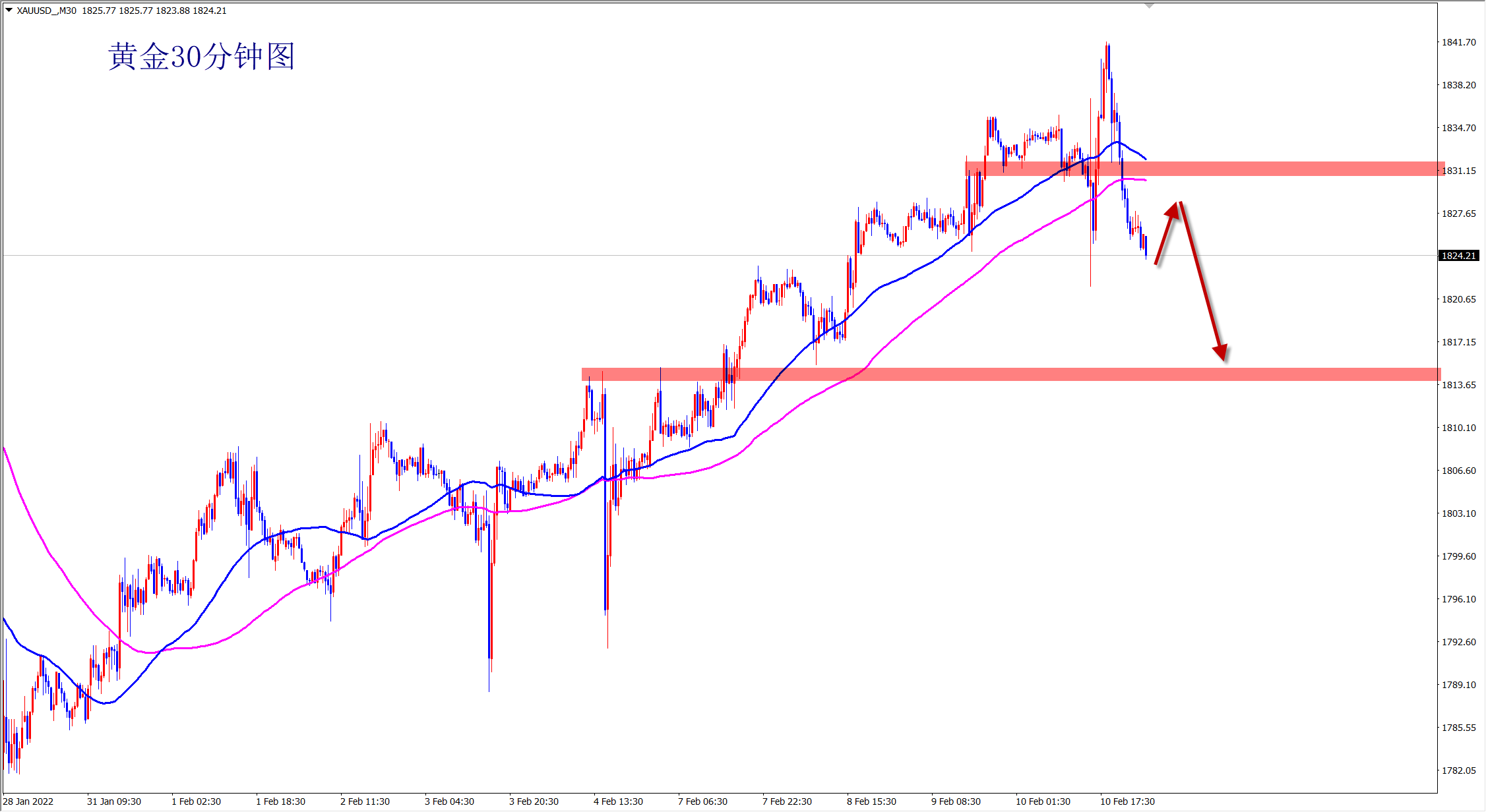 黄金昨日大涨大跌,剧烈震荡,最终在消息的刺激下大跌,并且即将跌破昨日的低点,大阴杀跌,空头强势,我们当前的思路很简单,干空,反弹就是直接空,下方目标关注1815的支撑!
