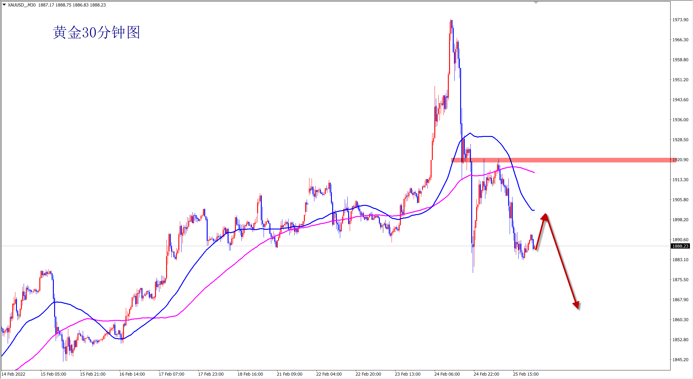 黄金本周调整后大涨,随后直接大跌破位,周线上以长上影线的阴线报收,阶段见顶的标志!下周黄金先震荡高空看跌,下方破位1885后将会开启新的跌势!