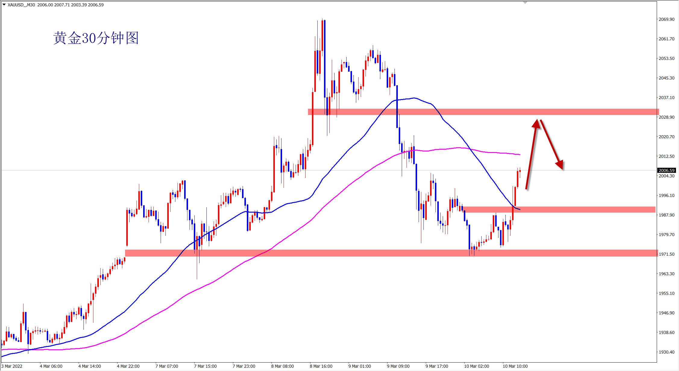 黄金此前大涨后大回落,今日在1970位置获得支撑后筑底反弹,再次卡其上涨走势,而且消息上也刺激黄金继续上行!并且突破了昨日2005的压力位置,黄金将会继续上涨,下一阻力位置是2040位置!