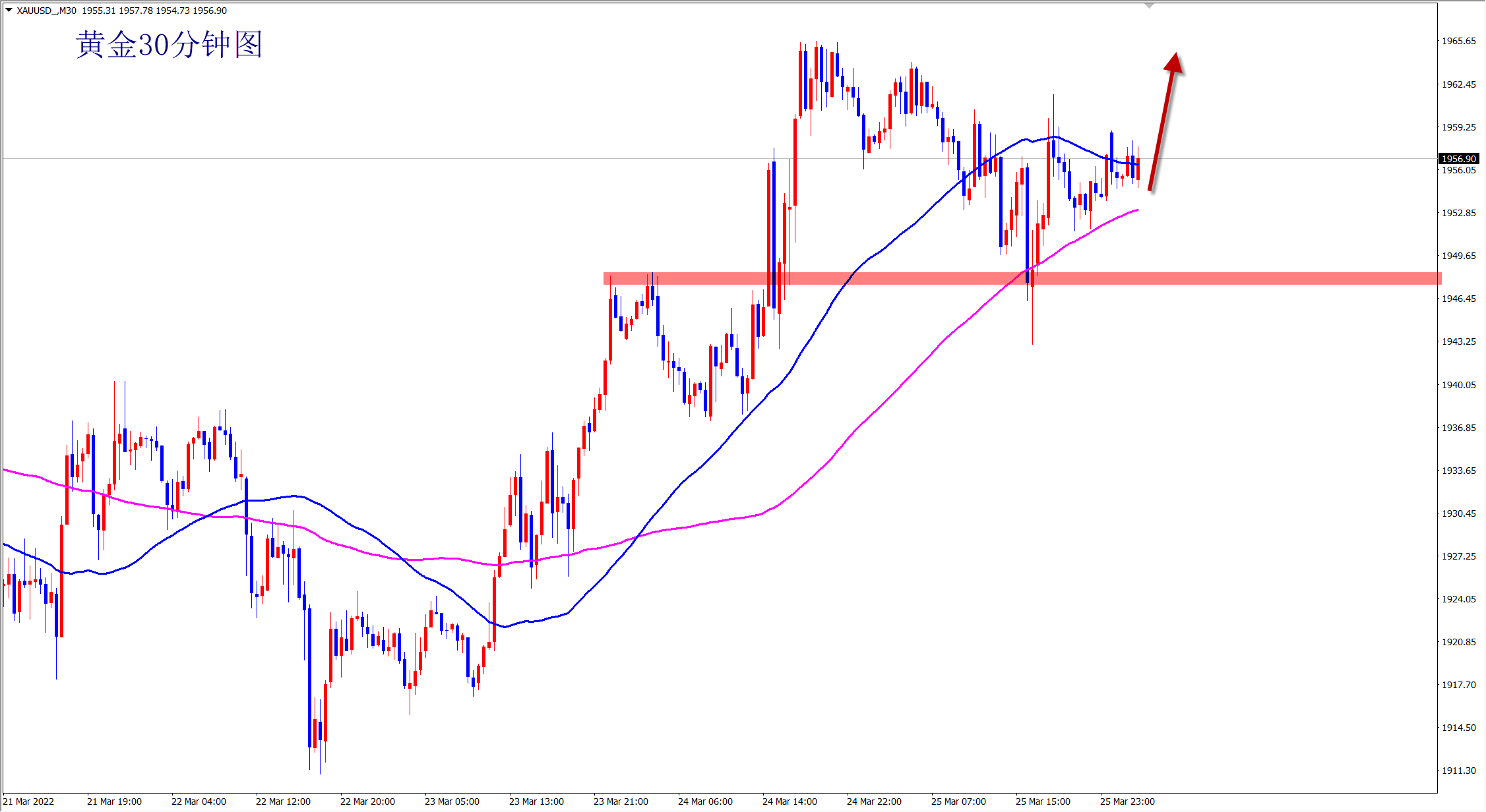 黄金当前站稳在30分钟均线上方,还是多头上涨走势不变,下方的关键支撑是1948位置,也是周五收线上方。这是当前多空分水岭位置,此位置上,黄金还是多头趋势!上方的压力关注1966前高是否突破,未突破前,震荡走势,低多为主,突破后将继续上涨至1980甚至2000!