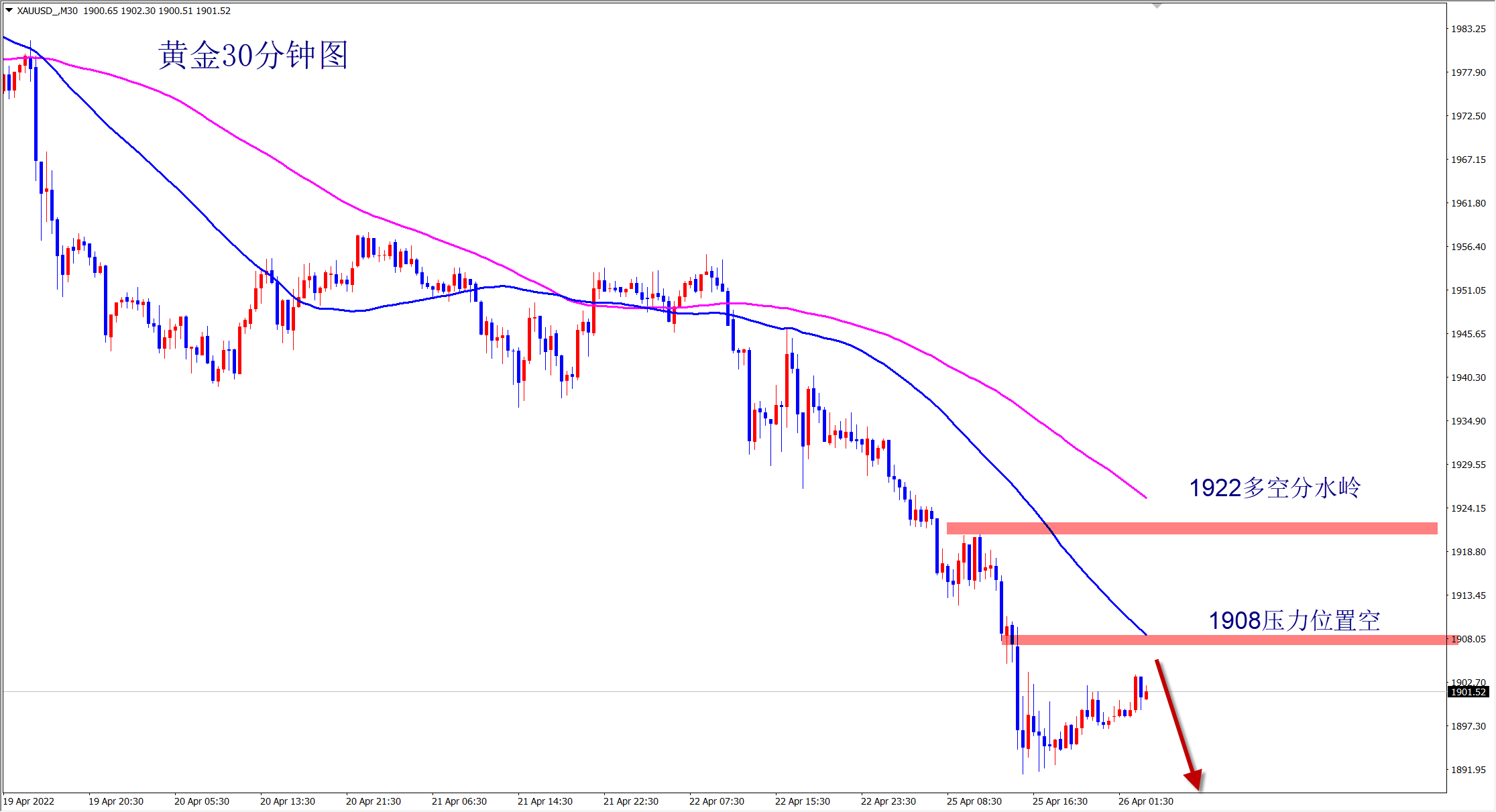 黄金今日还是继续干空不变,早盘依托1908压力直接空,下方继续关注1890是否破位,破位后将继续下看1970!趋势下跌,没有最低,只有更低!而上方的多空分水岭是1921位置,此位置下都是空头,只有强势突破1921,行情才会转变!