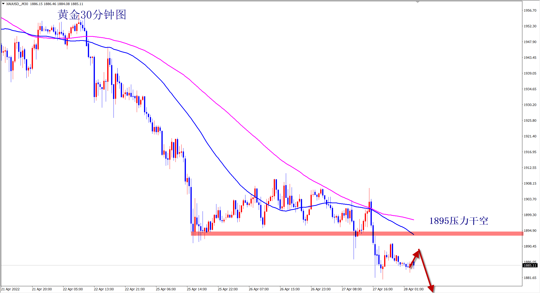 黄金依旧是下跌趋势,昨日分别在1904空,1900空和1890空,再次大跌拿下利润,顺势轻飘飘,慧根者会跟,相信产生价值,跟随裂变果实!今日黄金还是继续空不变,依托1895的压力干空!