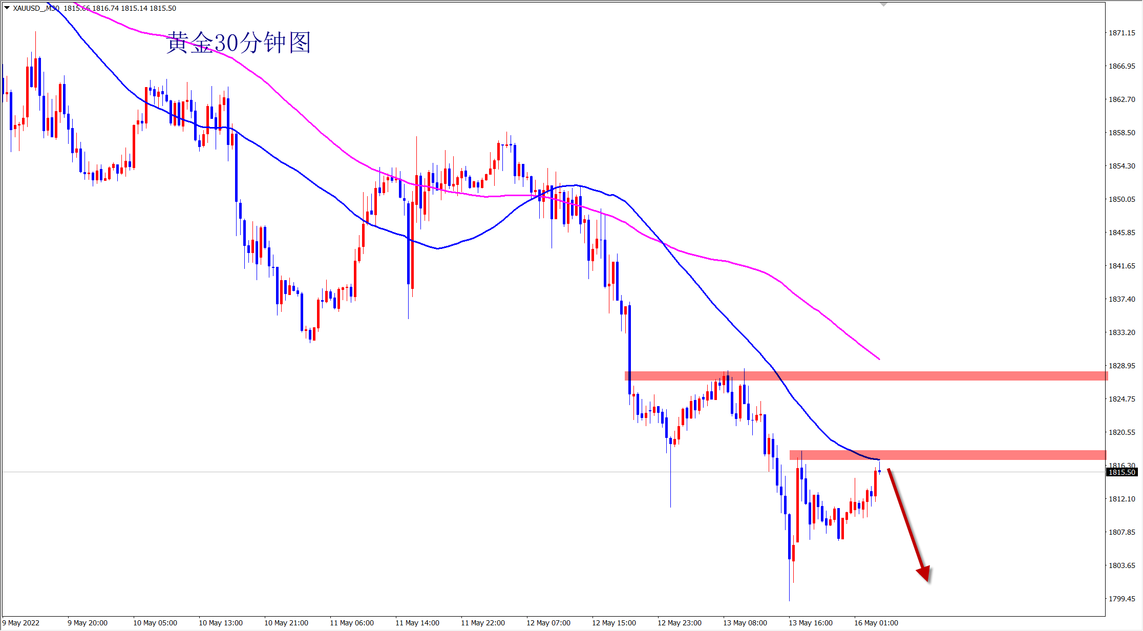 黄金1825下空,止损1832,目标1810-1800;