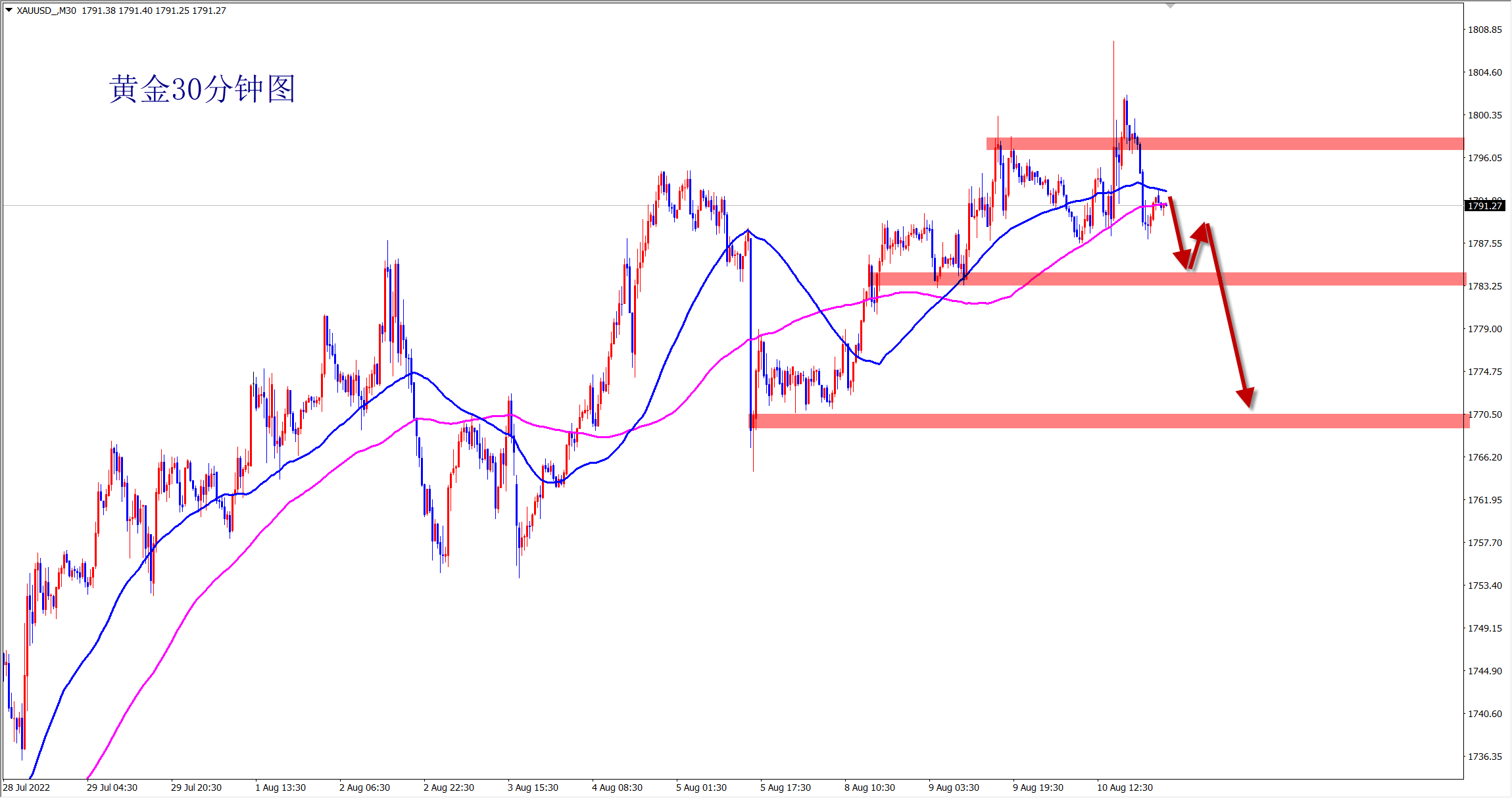 黄金当前上涨遇阻,并且大幅回落,早盘首要关注1786的低点,这是昨日回踩支撑位置,如果站稳,行情会在1786-1808区间内震荡,一旦破位,就要下看1770甚至更低!