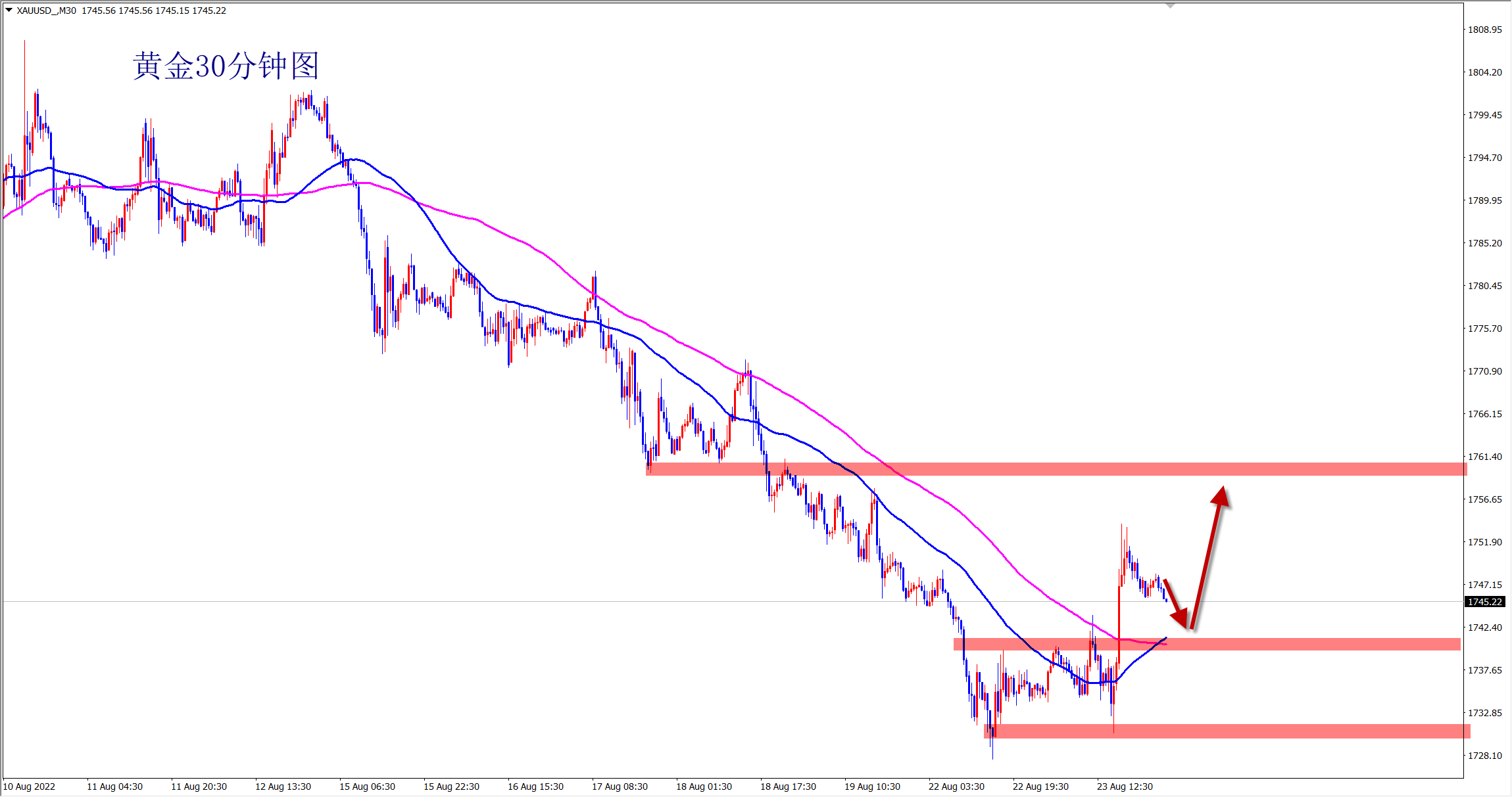 今日黄金按照底部震荡思路对待,早盘回落1735支撑附近继续干多!黄金经过连续大跌后终于见底开始反弹!但上方1760依旧是关键压力,反弹遇阻后再空!此前黄金30分钟级别上一直受到均线的压制,但是昨日开始突破,突破后压力变支撑,黄金发生改变,思路也要及时跟进!