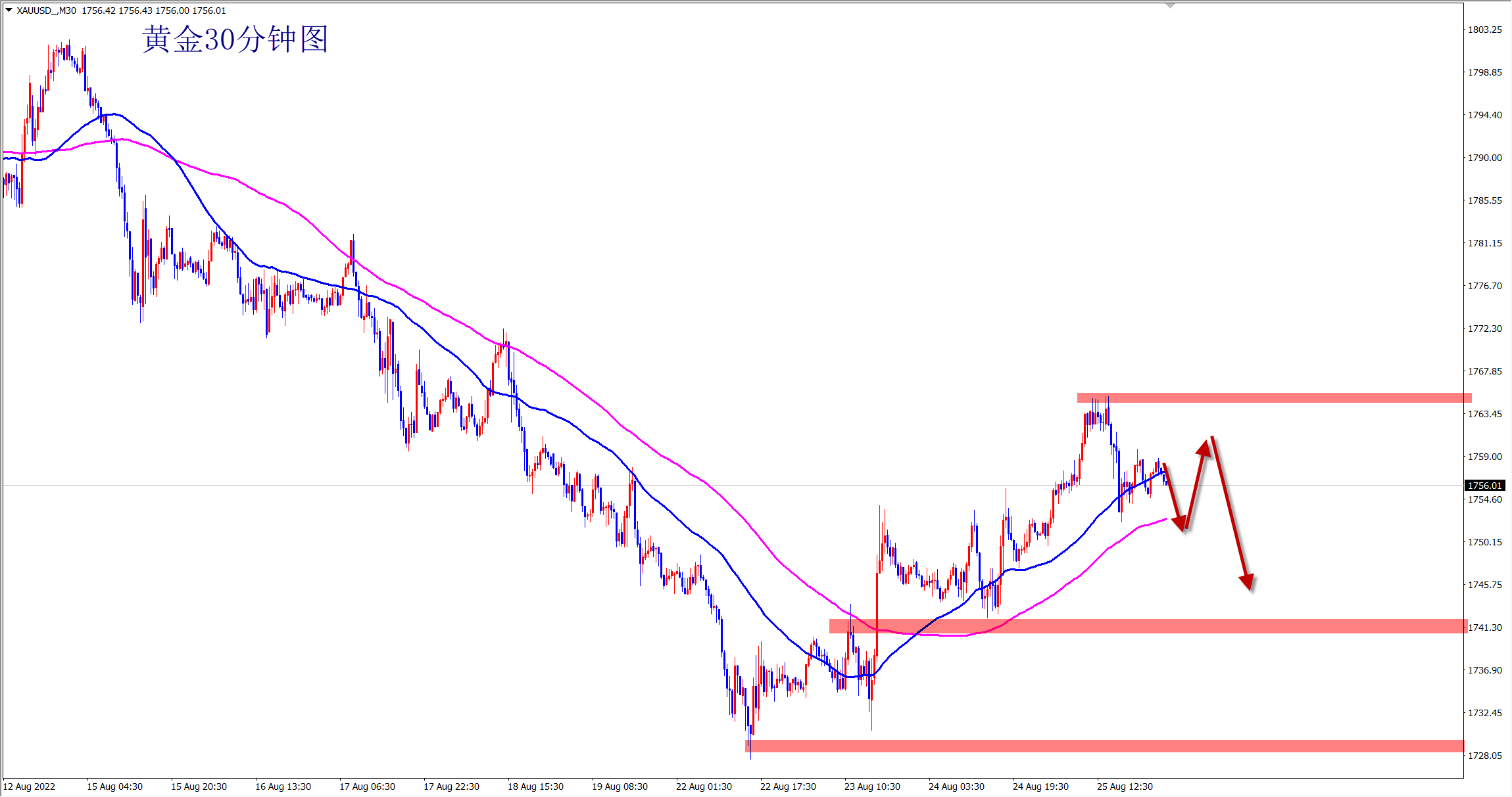 今日有鲍威尔的讲话,估计会对黄金的行情造成较大的波动,大概率还是继续下跌的走势,反弹继续空即可!