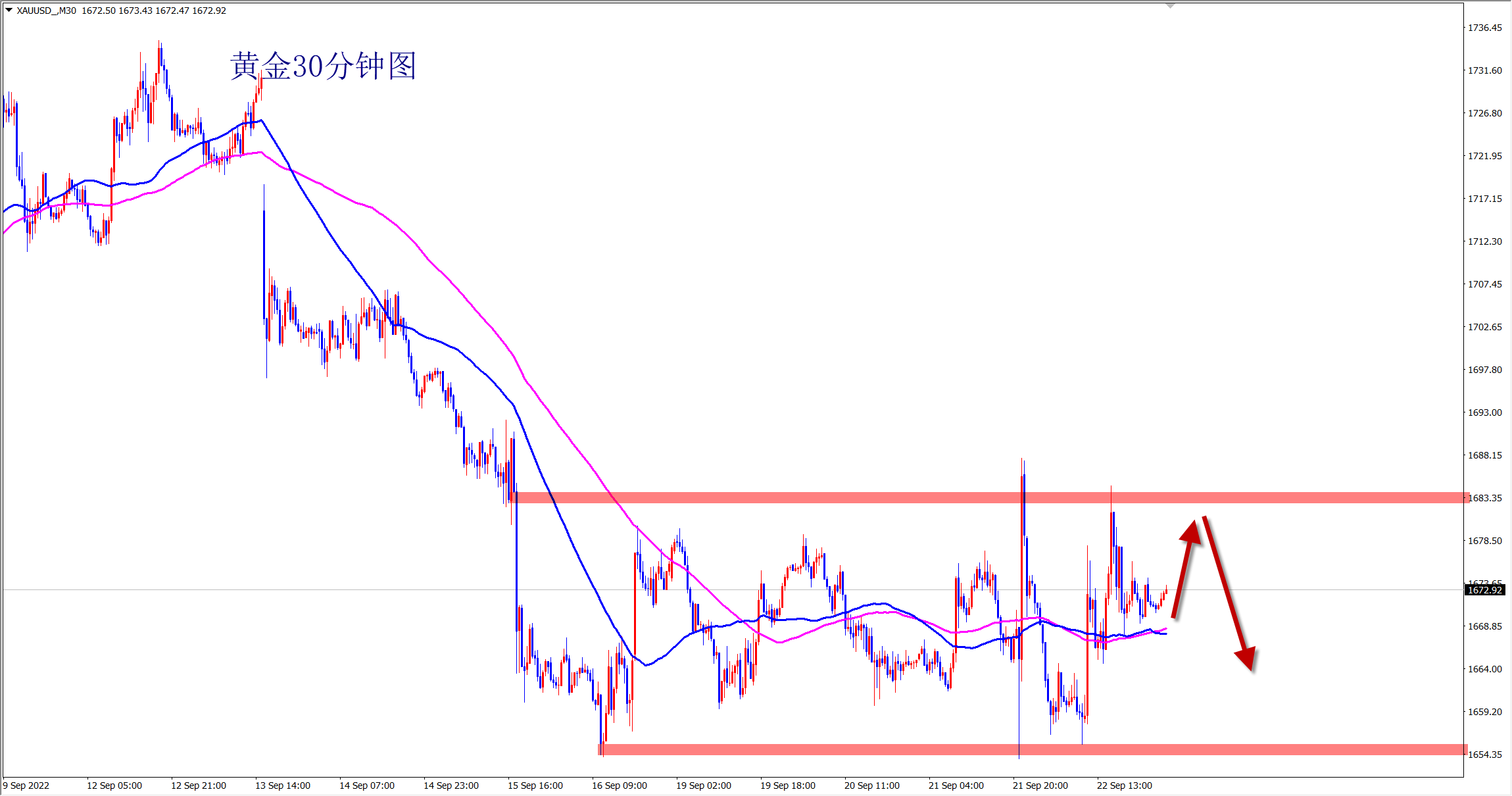黄金1685空,防守1692,目标1670-1660。