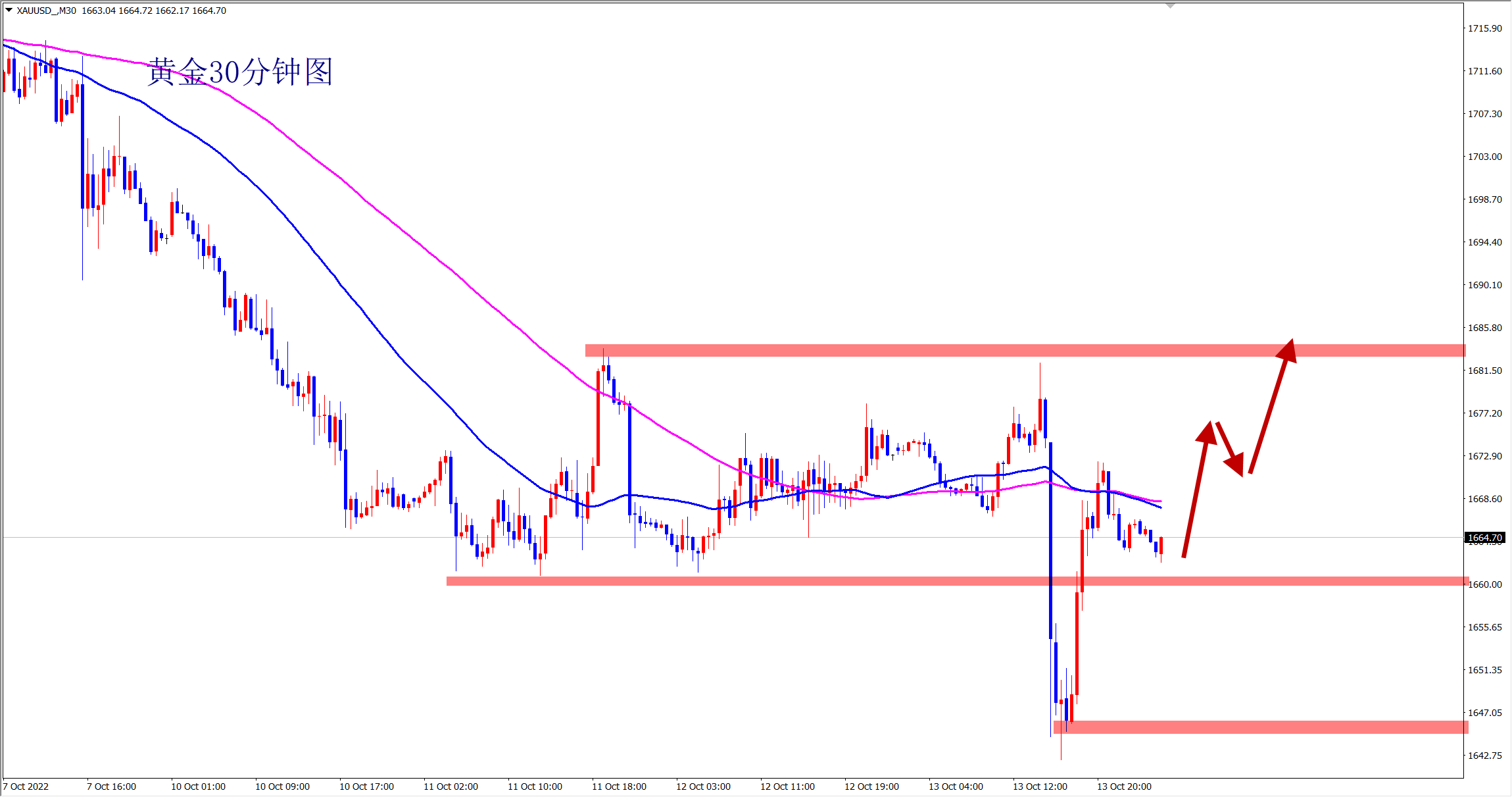 黄金昨日破位,但是下跌不延续,行情再次重回1660盘整区间内部,行情转多,今日开始反弹,做多看涨!
