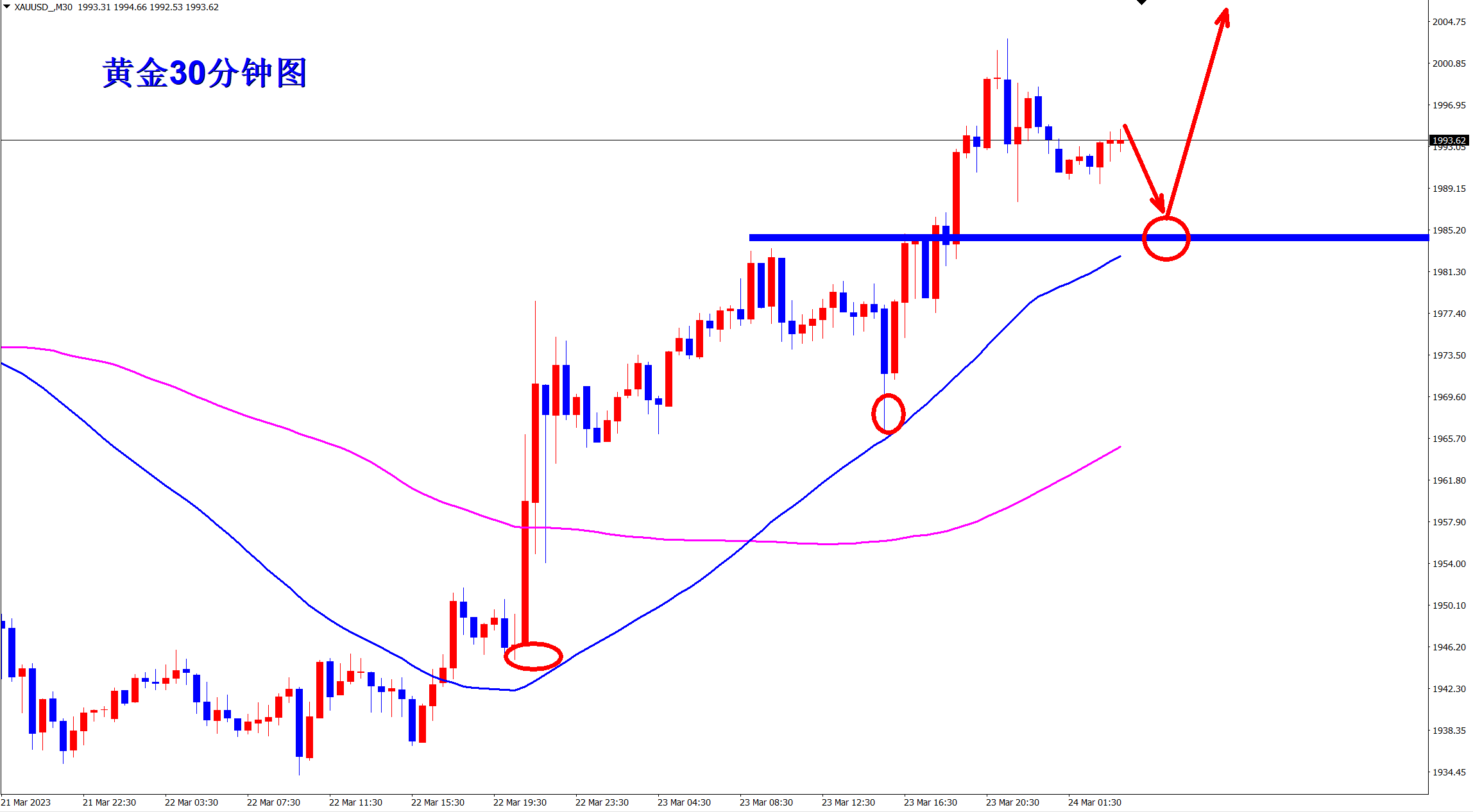 多,早盘依托1985的支撑继续干多!从30分钟上看,当前的黄金沿30分钟的均线支撑,重心不断上移!每次触及均线支撑后都会暴起新高!今日规律大概率还会延续,所以触及后继续多!1985支撑多!