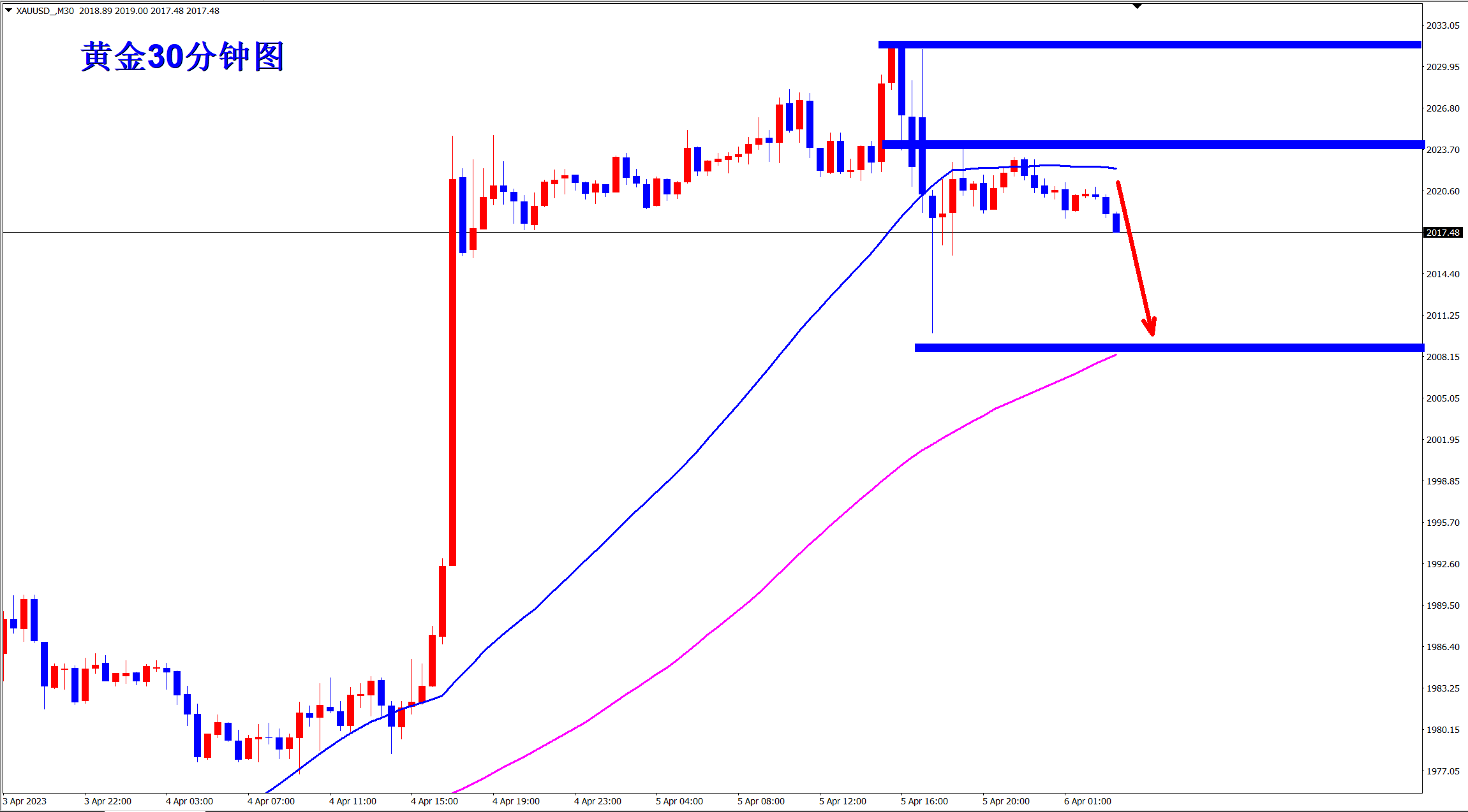 从30分钟上看,黄金已经明显的出现冲高回落,并且跌破了盘整支撑位置!调整开启,大涨之后必定对应大幅度的回调!短线支撑2015,破位后将跌向2008!