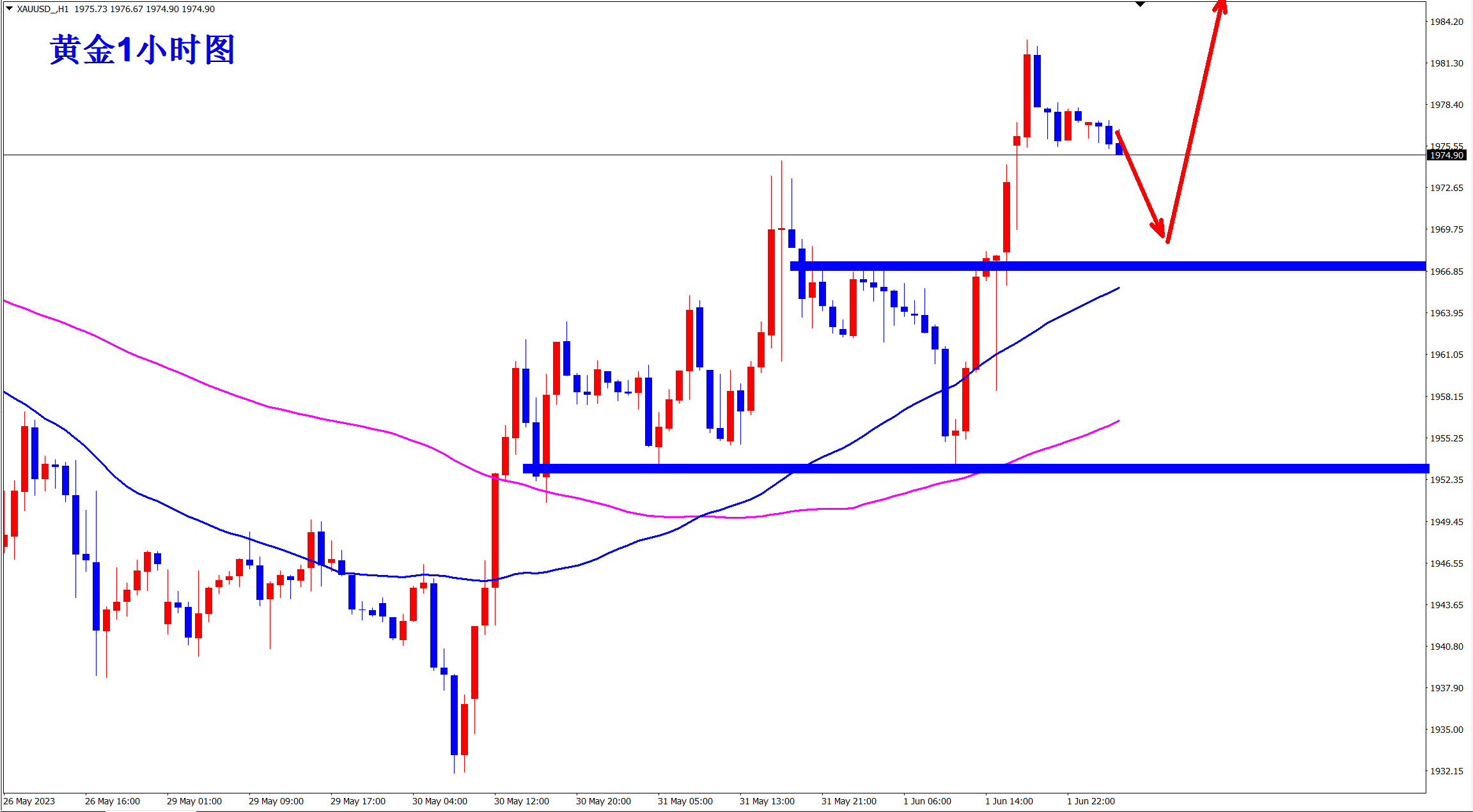 黄金干多已经四连胜,跟上王杨的节奏,就是跟随趋势!此前一路空,现在一路多,还有谁比王杨更坚定!今天我们要继续多,早盘依托1966的支撑回落干多!
