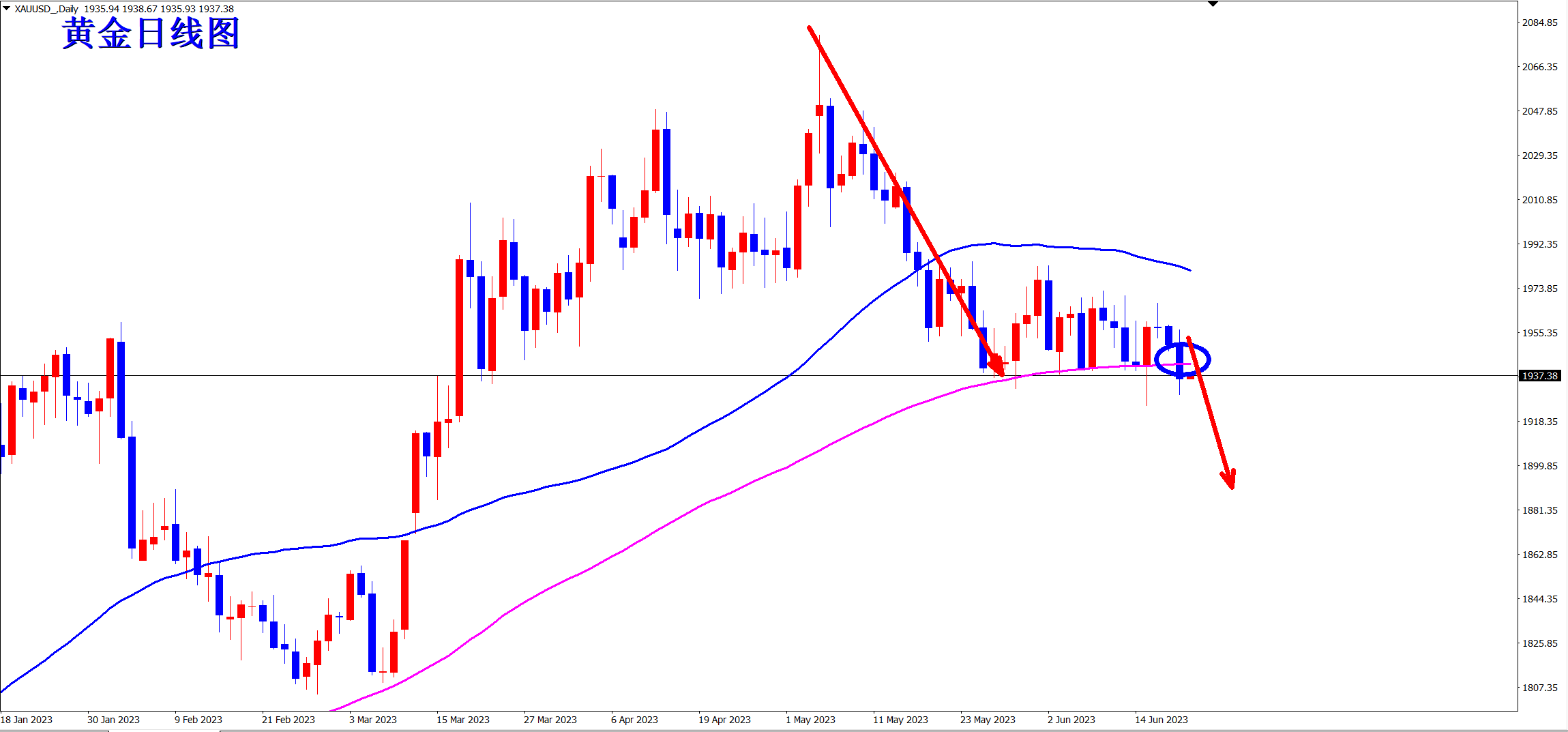 从走势上看,黄金似乎还是大区间的震荡,没有跌破前低1925的支撑!但是日线级别上可以看出,均线已经拐头向下!此前k线还维持在长期均线上方运行,但是昨日是直接破位!新的下跌开始,而新的下跌走势必将是和此前2080的这一波下跌形成对应!