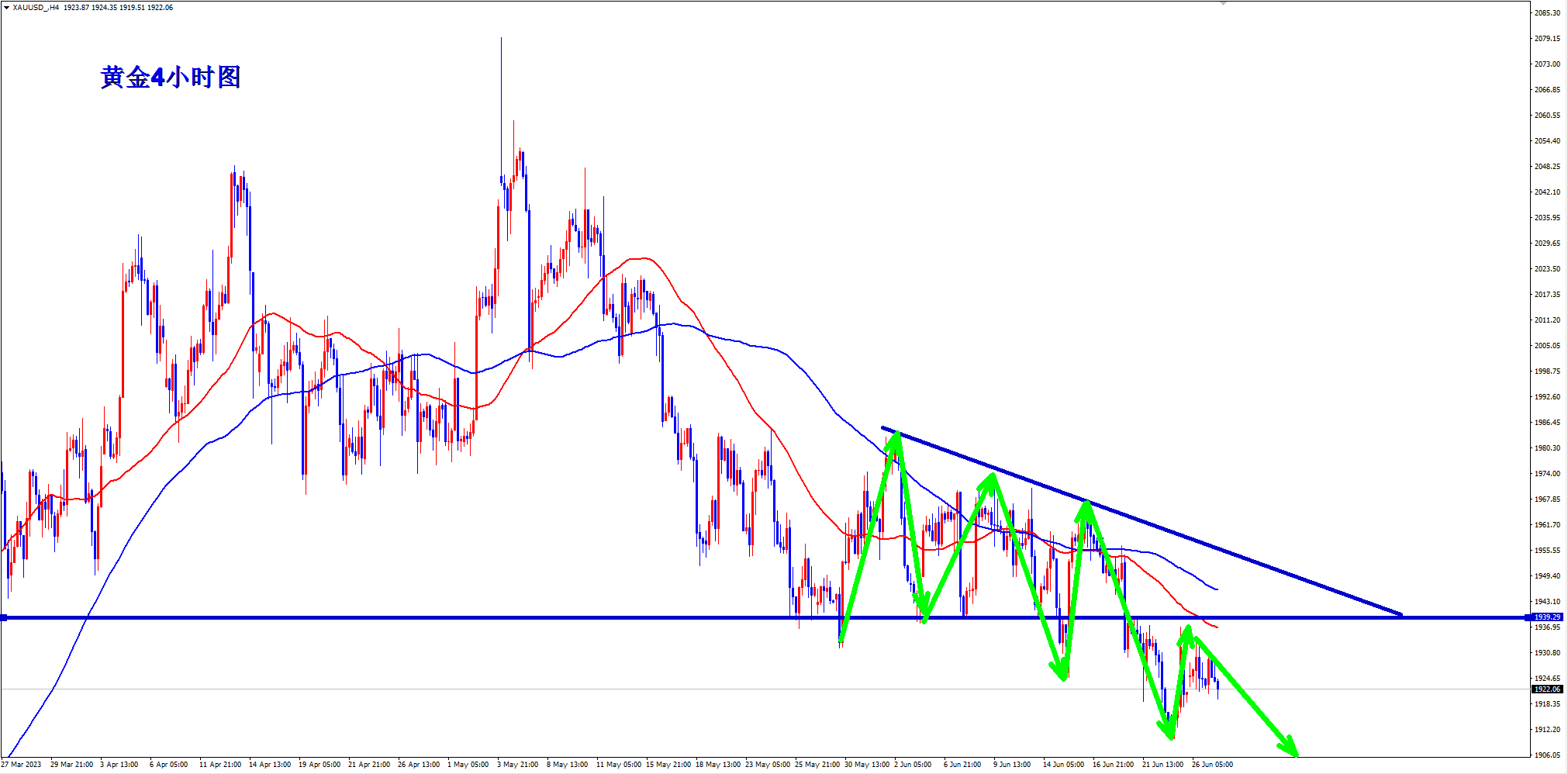 大行情来了如何看?继续空。黄金4小时下跌三角形破位之后走继续下跌的延续行情。这两日的反弹最终没有回到三角形的下边缘1940支撑,形成反压。所以在没有有效突破1940之前趋势上继续看空。均线死叉向下空头排列,反弹就是给干空的机会,最近三天反弹高点分别193719331930,高点依次接近等差排列降低,美盘反弹1927继续干空。