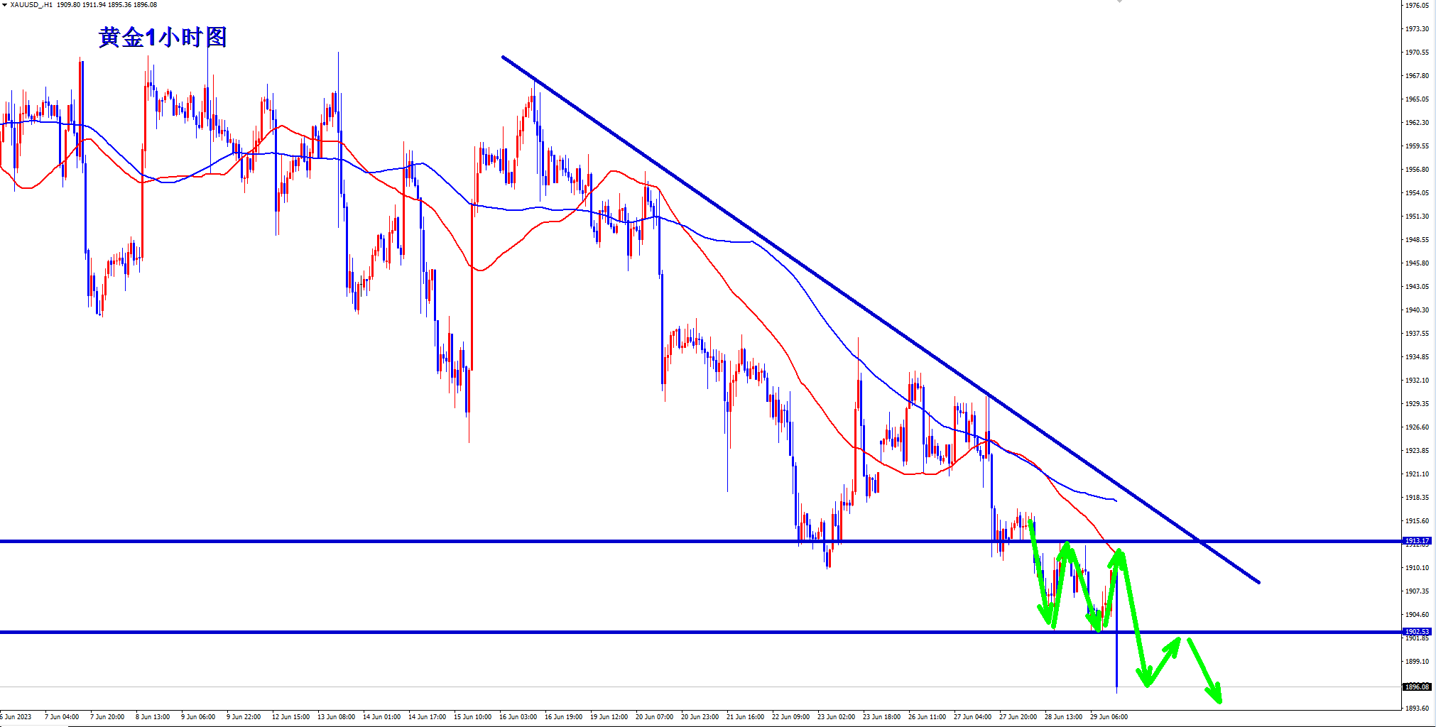 现在黄金跌破1900了,又该咋办,抄底?抄底不是我的风格,那就将趋势干到底,反弹继续干空,黄金跌破1900,继续创新低,空头行情这么明显,而且跌破1900整数关口并没有快速拉回,基本上可以确认有效跌破。黄金昨天跟今天低点1902支撑破位,美盘反弹1900附近直接继续干空。