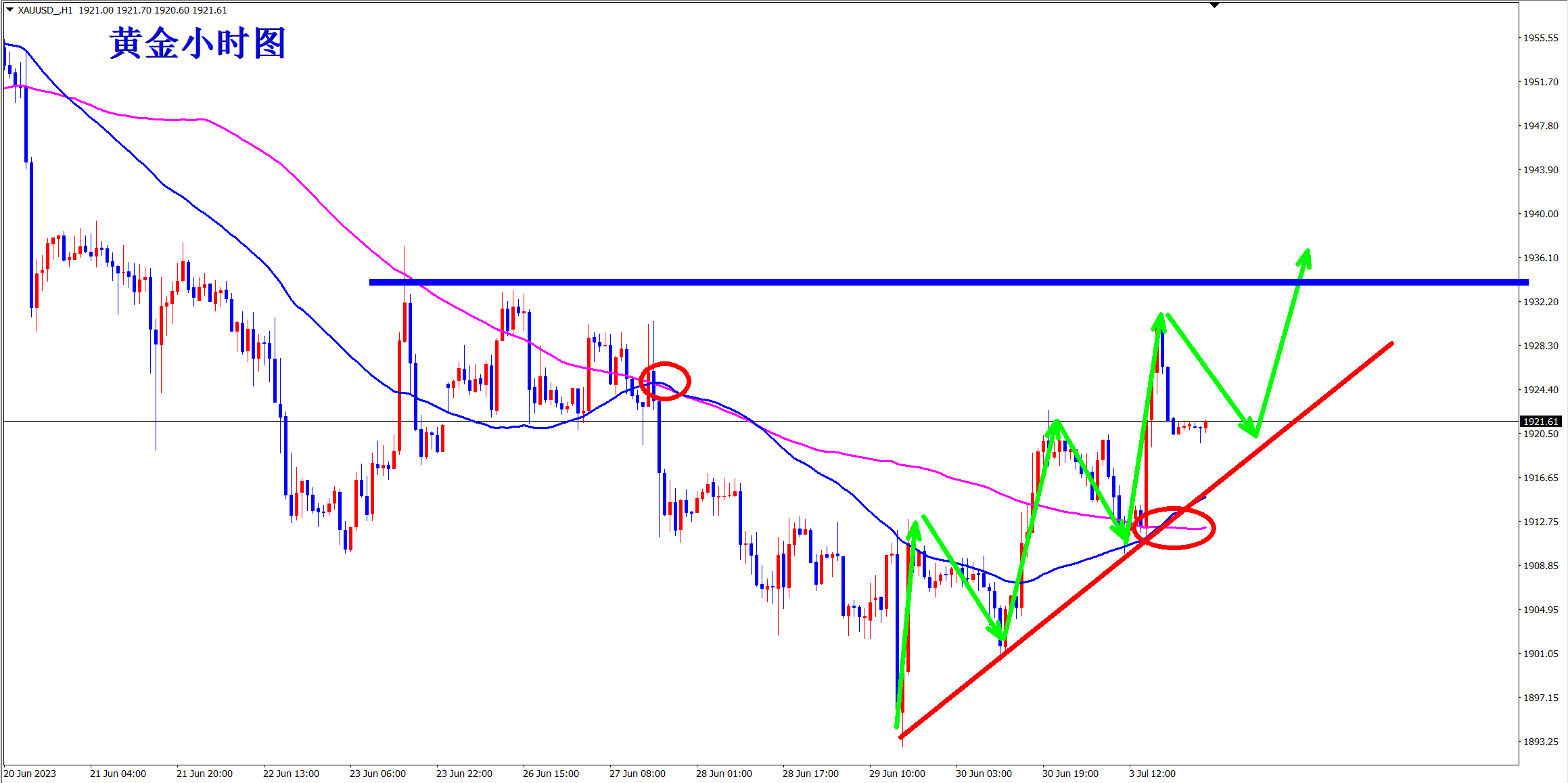 黄金从1小时级别上看,在1893底部构建了一个深V反转,形成头肩底形态后,继续上涨,突破均线的压制,并且昨日回踩站稳在均线之上!现在的黄金反弹低点连线形成趋势线支撑,所以今日回落趋势线支撑后还是要继续干多,点位就是1917一线!上方压力依旧是1933区域,突破后则证明行情真正开启反转!后面就全力干多了!