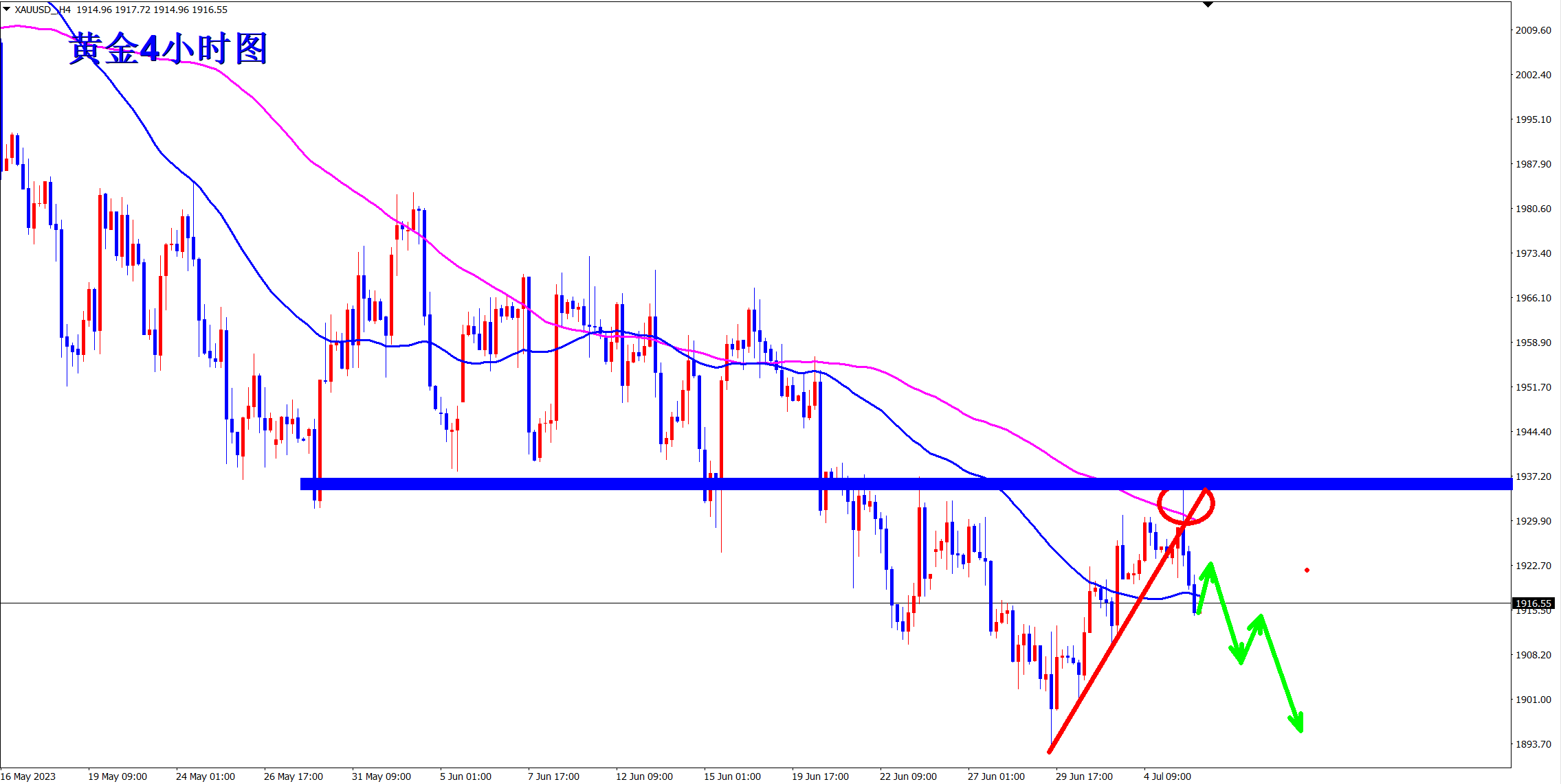 黄金4小时级别上很明显的还是下跌趋势,现在的K线依旧维持在均线下方运行!昨日反弹正好触及长期均线的压制后开始回落!趋势还是空头下跌走势!