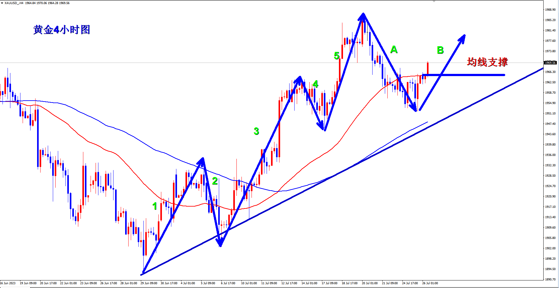 那是什么支持我们这两天一直看多呢?首先,黄金4小时依然受到上行趋势线支撑继续支撑黄金上涨,现在支撑上移到1952附近。其次,我们一直说黄金4小时经过五浪上涨,然后A浪的调整,随时谨防B浪的反弹,那么黄金B浪来了,黄金如期上涨了。最后黄金4小时均线同样金叉向上排列。所以说至少短期我们没有必要去过分看空甚至去追空的必要。