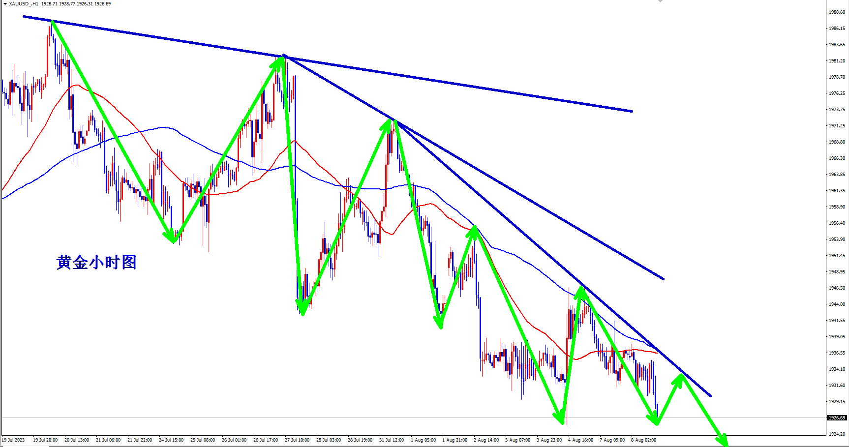 黄金1小时下行趋势线继续压制黄金上涨,而且昨天今天黄金不断创新低,每次反弹都是比较有限,不能创出新高,明显的下行空头趋势,黄金1小时下行趋势线阻力已经下移至1935,美盘黄金反弹1935继续干空。
