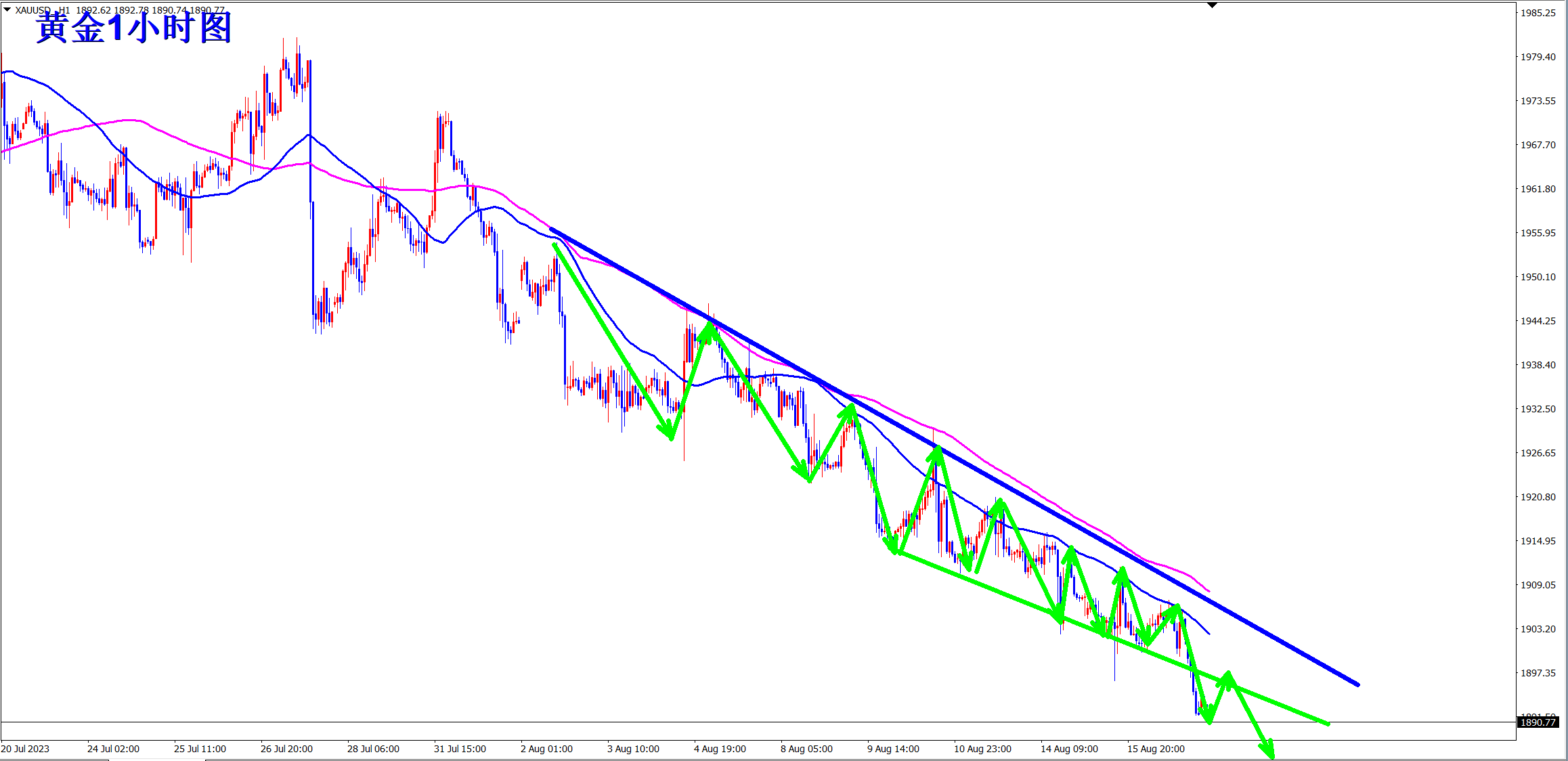 黄金当前跌跌不休,凌晨美联储会议,继续鹰派,黄金应声下跌!顺势轻飘飘,逆势乱糟糟,继续将顺势干空进行到底!早盘依托1900压力干空!