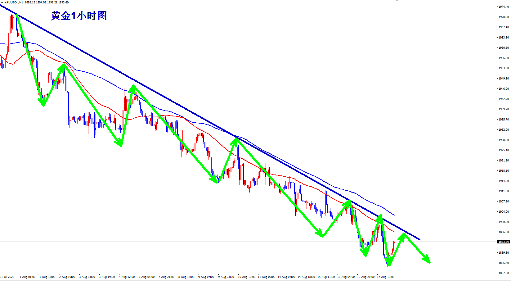 黄金昨日后半夜又创新低,下跌至1885附近,均线继续向下空头排列发散,没有任何拐头迹象。1小时趋势线把黄金多头最近压制的没有丝毫还手之力,黄金趋势线阻力现在下移至1898附近,反弹1898下都是逢高干空的机会,现价1895可以直接先空。