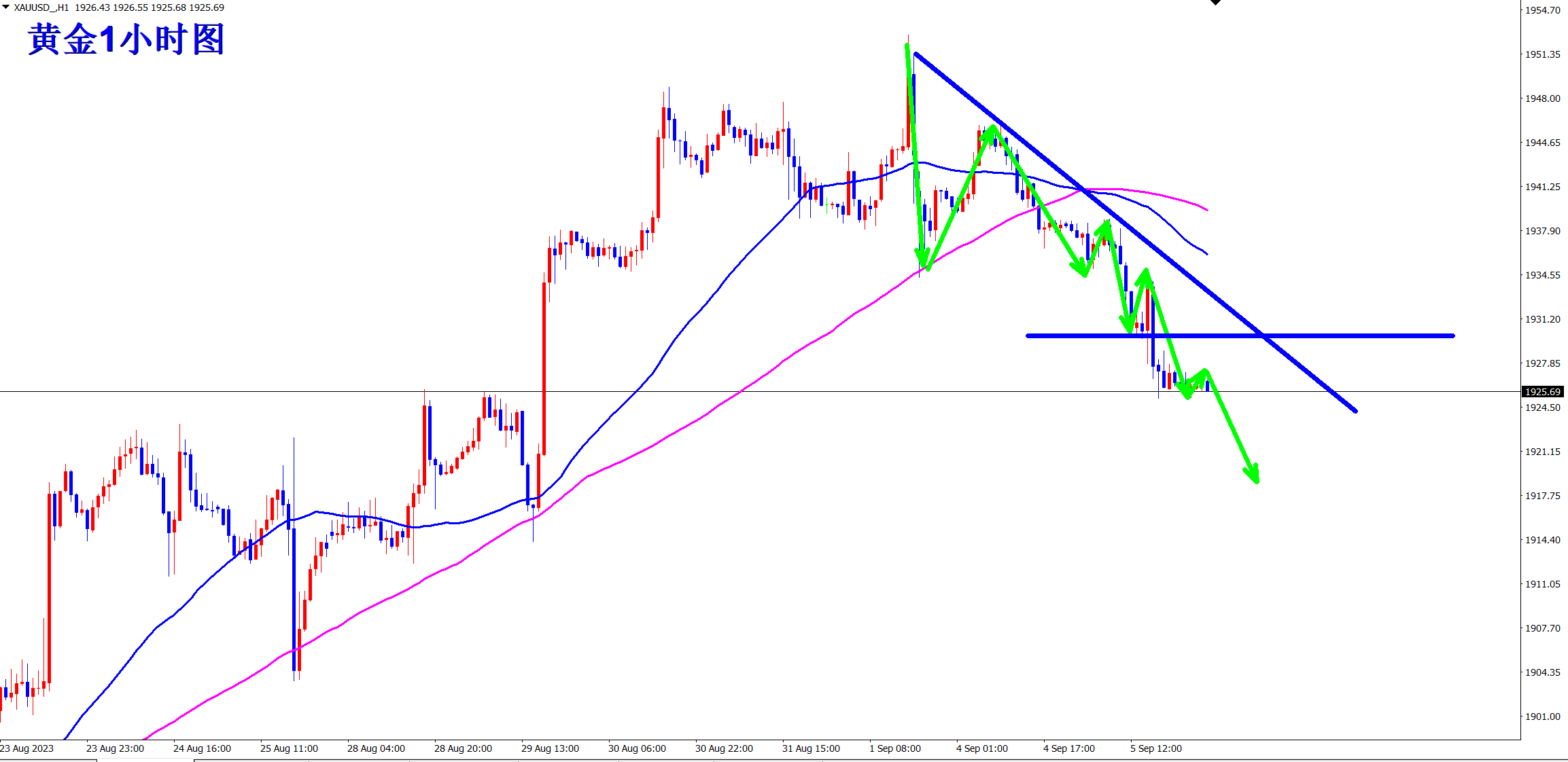 黄金本周做空已经三连胜,顺势轻飘飘,逆势乱糟糟!顺势而为,每一次王杨都紧跟趋势,不断收割!当前跌势继续,反弹依旧做空,依托1930的压力干空!