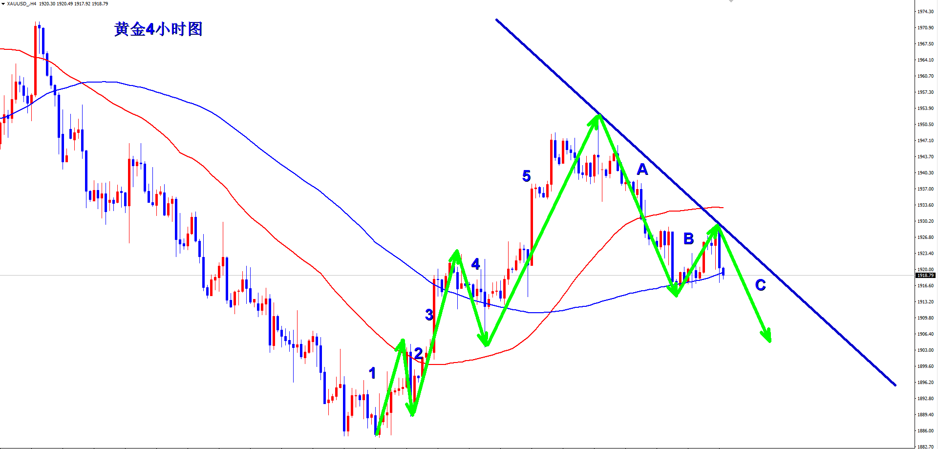 黄金昨日美盘虽然看似反弹凶猛,不过很快就冲高回落,说明黄金只是诱多,那么下跌就远远还没有结束。黄金4小时经过五浪上涨之后开启ABC浪的调整,当前处于C浪下跌。C浪下跌破位前期新低也在情理之中。黄金4小时下行趋势线阻力现在下移到1927附近的位置,下周反弹1927继续干空。