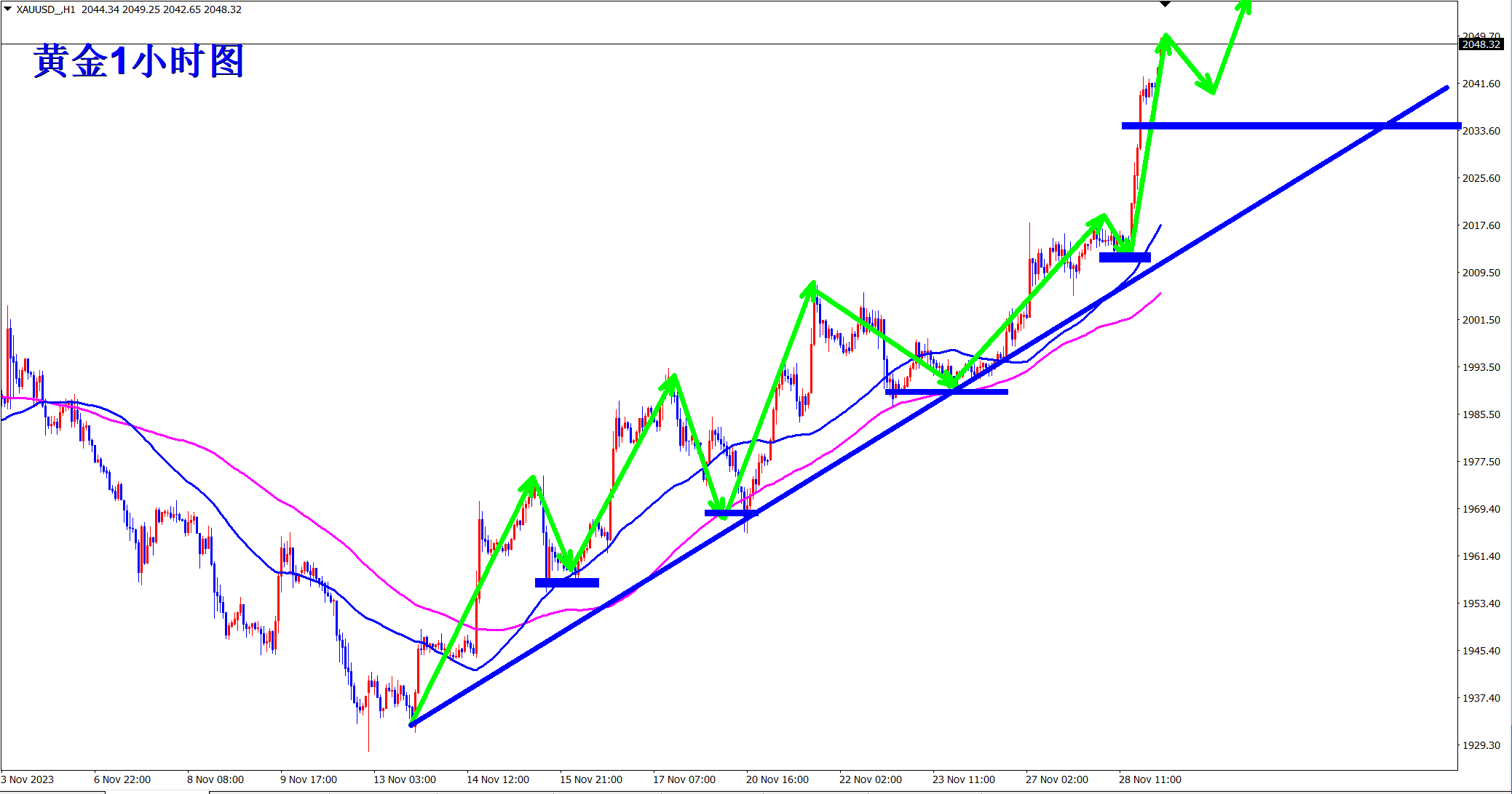 黄金1小时级别上走势非常明显,都是沿着均线震荡上行的,而且每次回踩均线支撑时都是新的波段上涨的开始!涨势继续,当前的支撑是2033的位置,此位置上黄金回踩仍是干多的机会!早盘抓住回调,继续多!