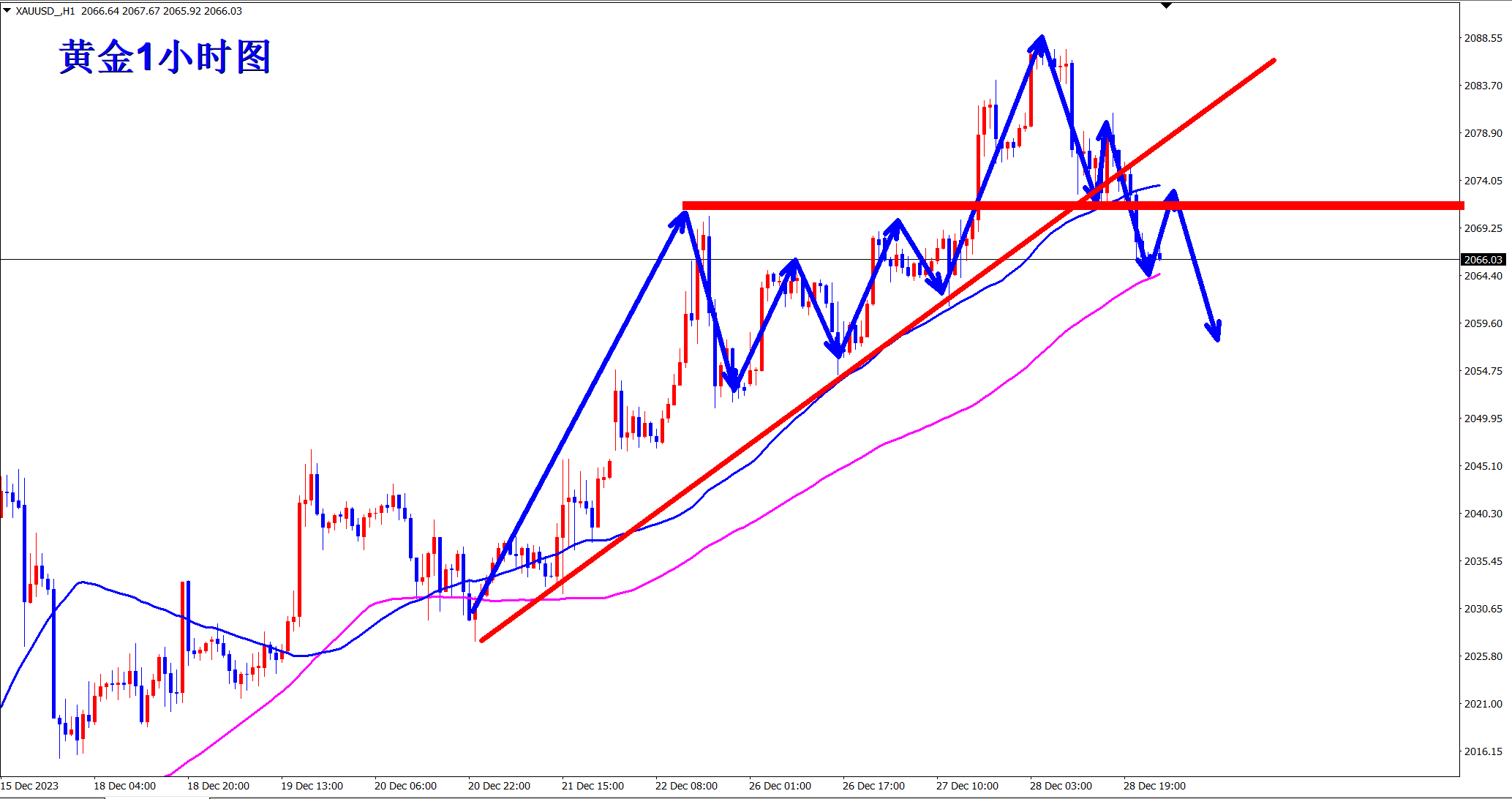 顺势轻飘飘,逆势乱糟糟,我们继续将顺势的原则进行到底!早盘依托压力开始干空!上方的压力就是短期均线压制2073位置,也是之前反弹压力位置!这是今日黄金做空的关键压力位置,反弹遇阻后直接空!