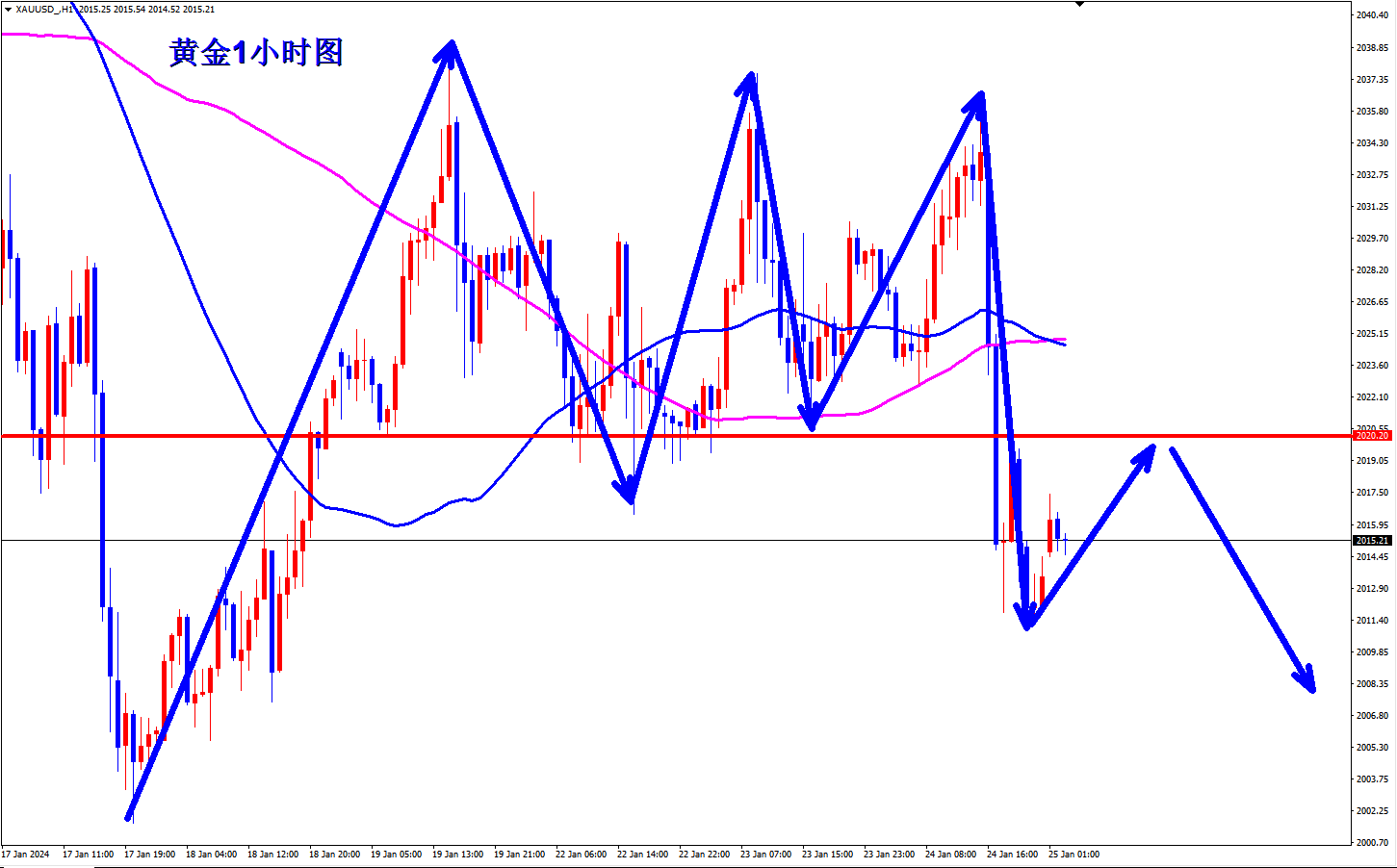 黄金1小时均线直接死叉空头排列,向下的空间刚刚被打开,黄金1小时形态三重顶,而且已经跌破了颈线位,昨日反弹2020附近直接受阻下跌,今天反弹2020阻力位直接继续干空。