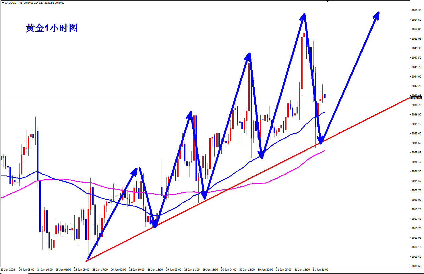 黄金1小时均线还是多头排列,而且上行趋势保持完好,黄金半夜回踩趋势线之后再次反弹,最近黄金每次上涨都是创出新高,每次回落不再创新低了,而且每次快速回落之后就是蓄势慢涨,随后多头就创出高点,所以黄金整体还是震荡向上的走势。今天黄金回落2035继续先干多。