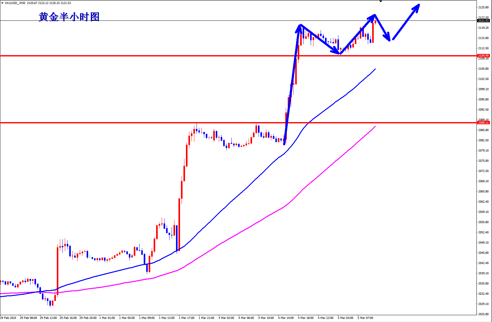 黄金再次创新高,没有办法,现在黄金的行情就是这么难受,多头等回调进多,就是不回调,空头干空就是不下跌。当然趋势是多,还是继续干多为主。黄金几次在2110附近继续发力上涨,黄金短线支撑2110上继续逢低干多,午后最低下探2113附近就直接快速上涨,欧盘回落2113继续干多。
