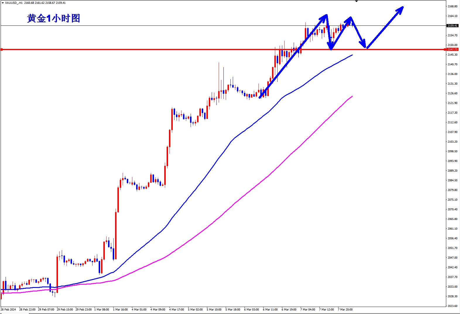 黄金1小时均线继续金叉向上多头排列,昨天美盘黄金也只是回落2148附近就止步继续上涨,现在黄金的牛市,千金难买牛回头,回落就是给干多的机会。黄金早盘回落2148上都是给逢低干多的机会,早盘回落2150附近继续多。