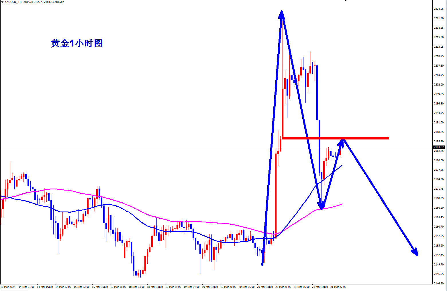 黄金1小时我们昨天给出了一个倒V的走势,黄金果然也是如期走出了个倒V的形态,黄金昨天早上起涨点2187附近而且就是快速上涨,晚上直接再次回跌直接破位,黄金今天2187下都是逢高给干空的机会,早盘2185附近可以直接先空起来。