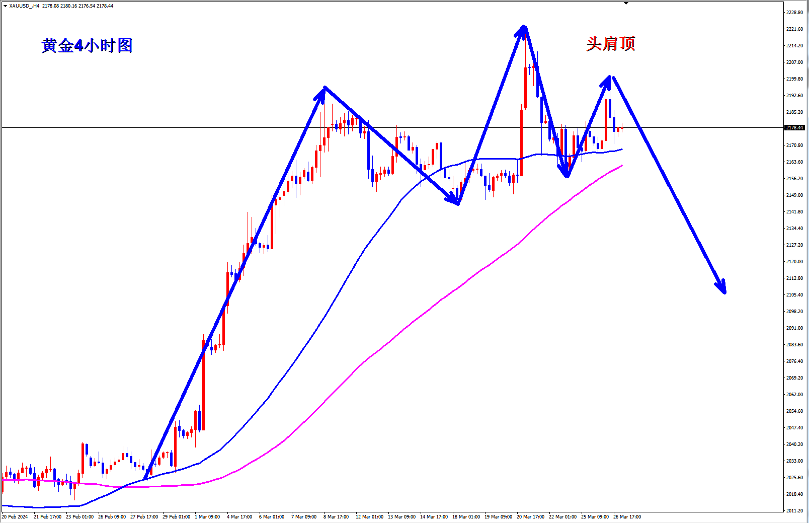 黄金4小时均线开始走平,如果拐头向下形成死叉,那么黄金就还会有很大空间下跌,黄金4小时头肩顶结构,黄金顶部迹象明显,多次冲高回落,上涨也不再持续,黄金并没有创新高,黄金今天可以在昨晚美盘第三次反弹高点2185附近继续干空。
