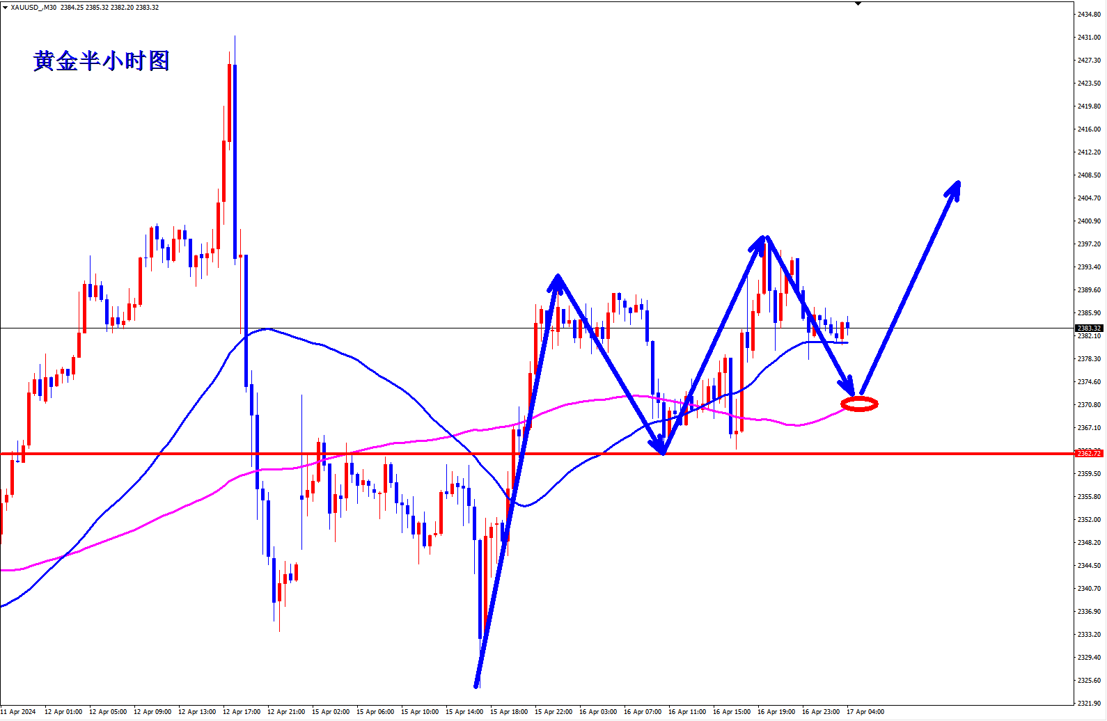 黄金30分钟昨日两次探底2362附近支撑企稳上涨,今天回踩2362支撑上企稳继续干多为主,黄金长期均线支撑在2370附近,早盘回踩2370附近可以先多起来。不过最近黄金的行情不再像之前一样单边强势,随时也有转弱的迹象,高位的时候还是谨慎追多,耐心等待回落。