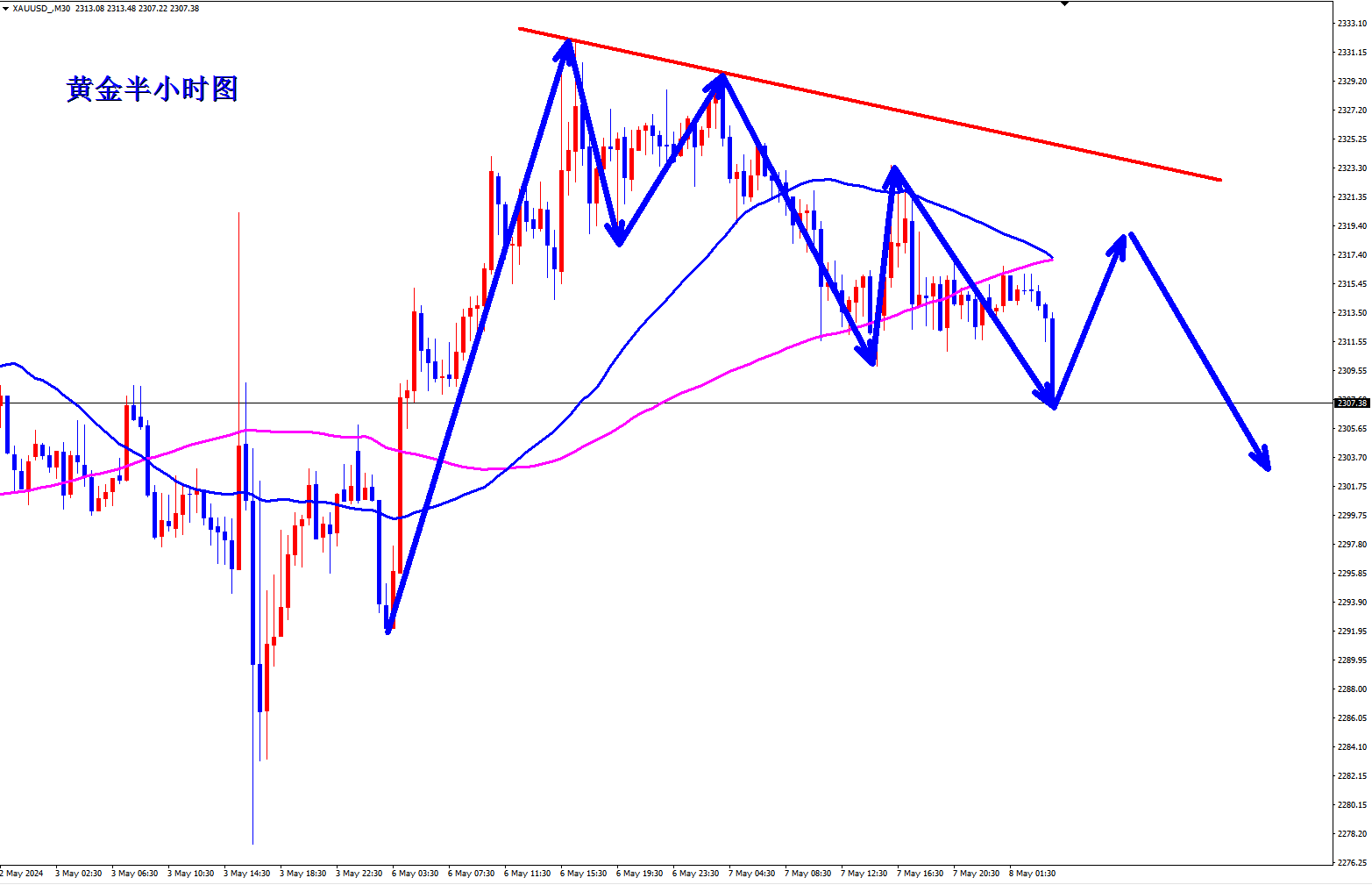 黄金30分钟上涨力度已经不足,开始受下行趋势线压制,黄金30分钟均线也即将形成死叉,如果形成死叉,那么黄金下跌空间又将打开,黄金趋势线阻力现在下移到2325,早盘反弹2325下都是逢高给干空的机会,黄金昨日美盘反弹高点2323一线附近可以继续空。