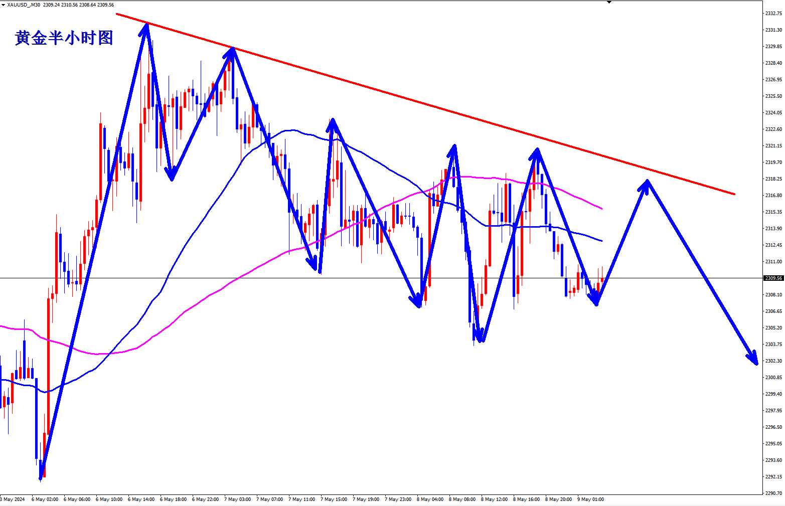 黄金30分钟均线还是死叉向下空头排列,黄金30分钟看似反弹强势,还是没有能够突破站稳下行趋势线阻力,黄金下行趋势线阻力现在下移到2320附近,早盘反弹2320下继续逢高干空。
