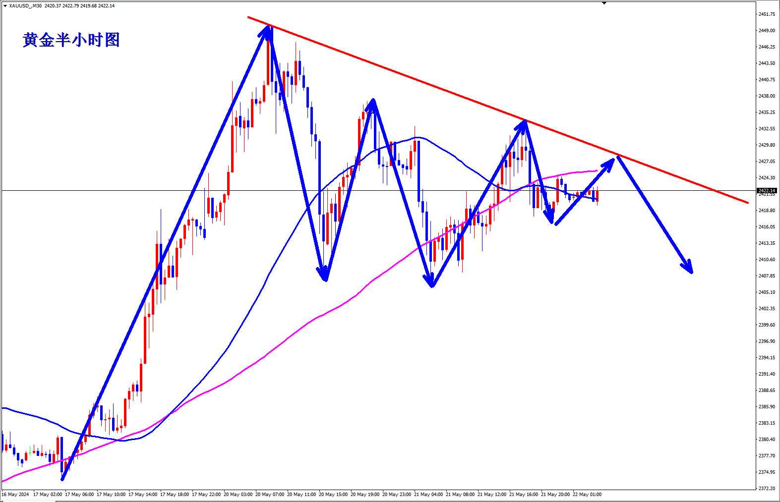 黄金30分钟均线开始形成死叉向下,黄金反弹力度有限,昨日多次反弹到2430上方冲高回落,说明黄金在2430上方阻力重重,短线黄金30分钟继续保持震荡下行的走势,黄金早盘反弹2430阻力继续干空,黄金30分钟下跌趋势线阻力2428附近可以先空起来。
