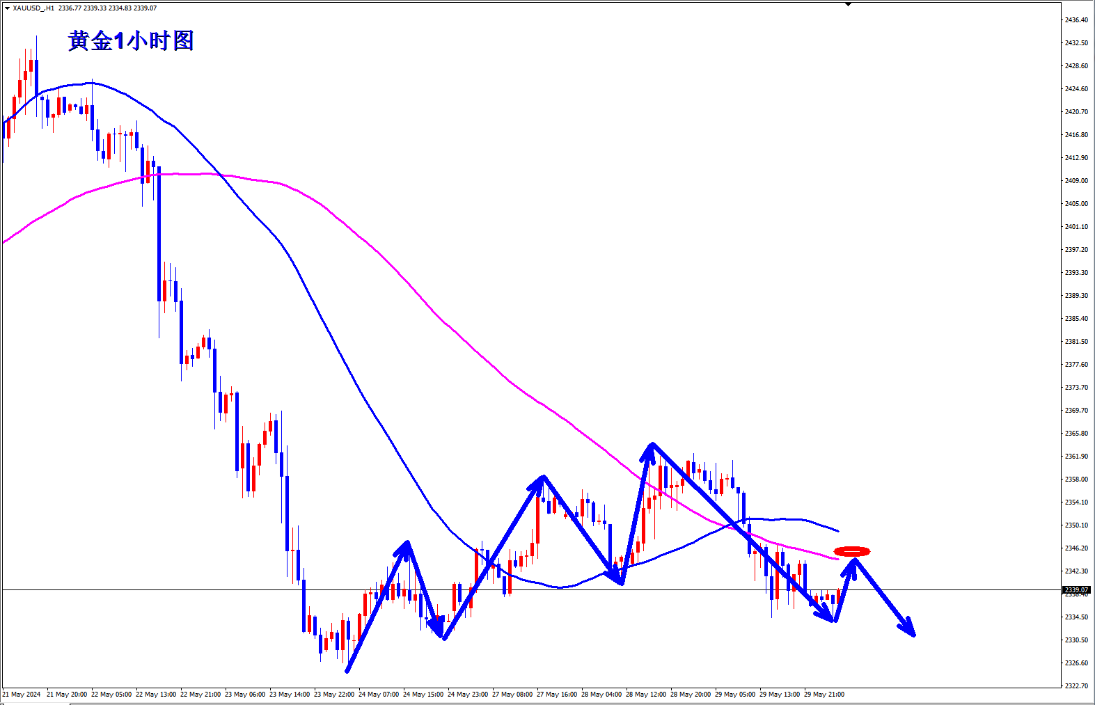 黄金1小时并未站稳均线,黄金均线还是拐头,而且再次跌破均线,黄金均线阻力附近继续干空,黄金均线阻力现在下移到2345附近,早盘2345继续先空起来。