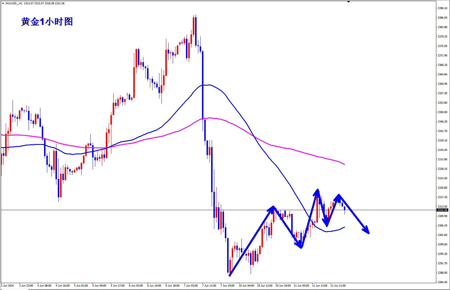 黄金1小时反弹高点依次降低,黄金昨天反弹那么强也仅仅只是反弹到了2320附近,黄金就只是反弹而已,行情没有反转,黄金2320下继续逢高干空,早盘现价2313可以空起来。